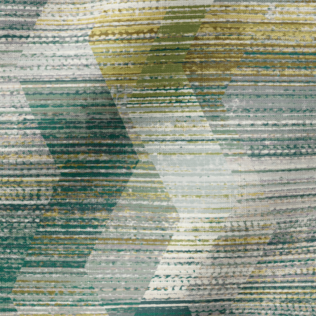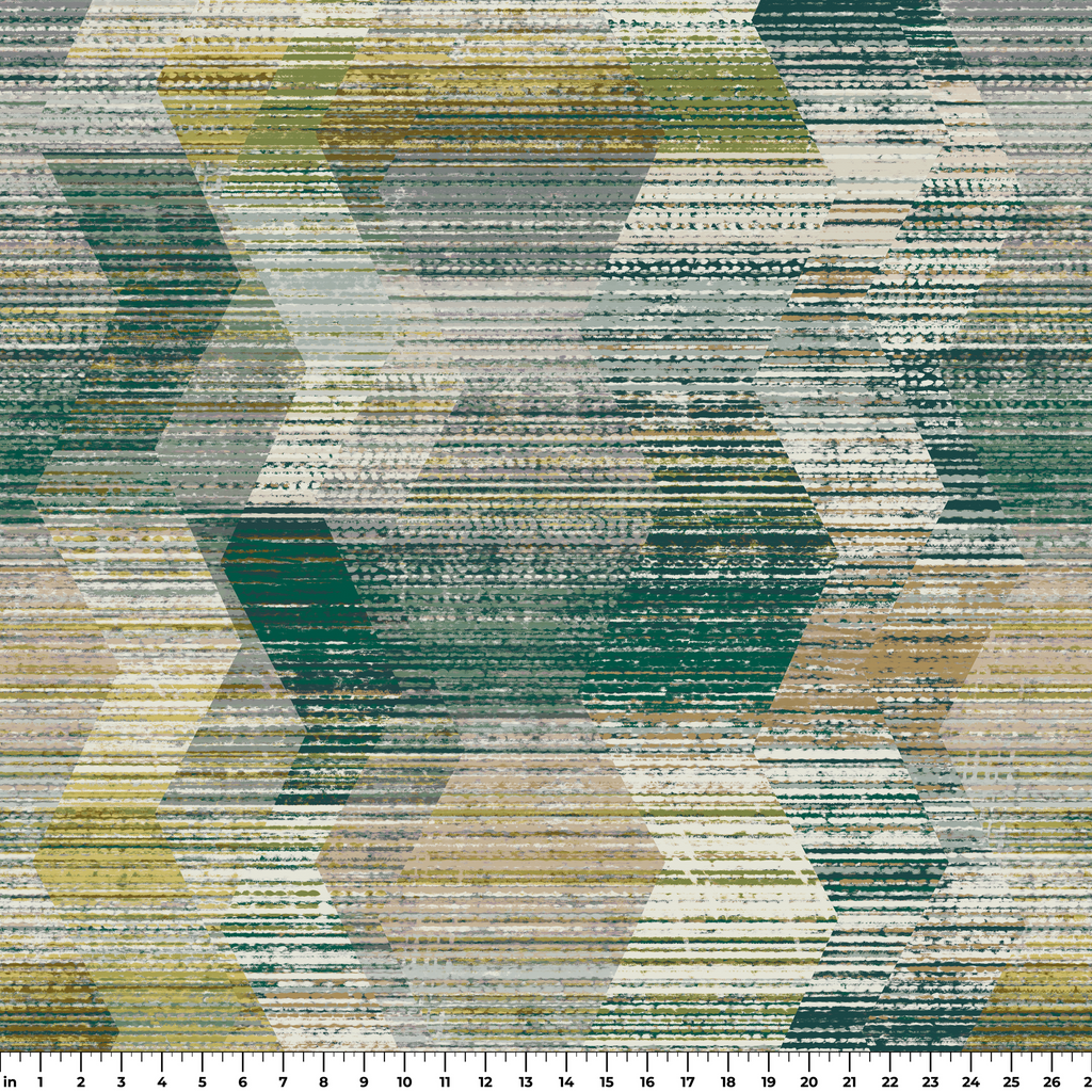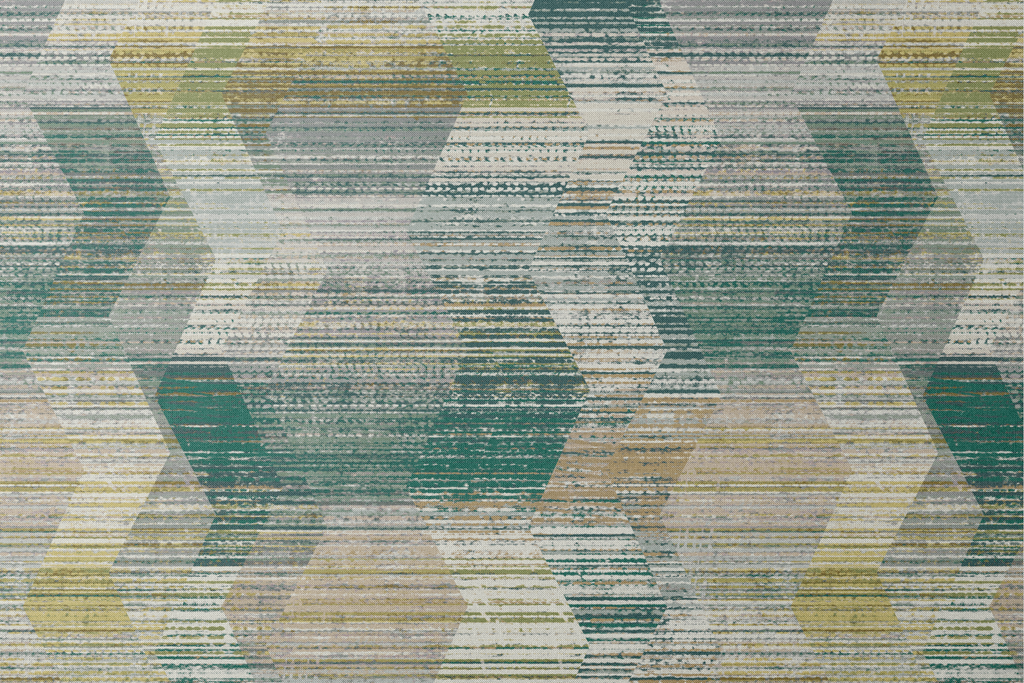Modern abstract geometric pattern in teal, green, and mustard tones featuring distressed horizontal lines and overlapping hexagons for a sophisticated contemporary look.