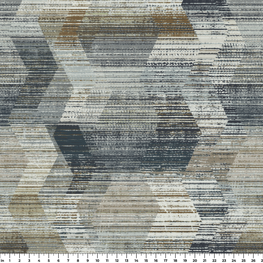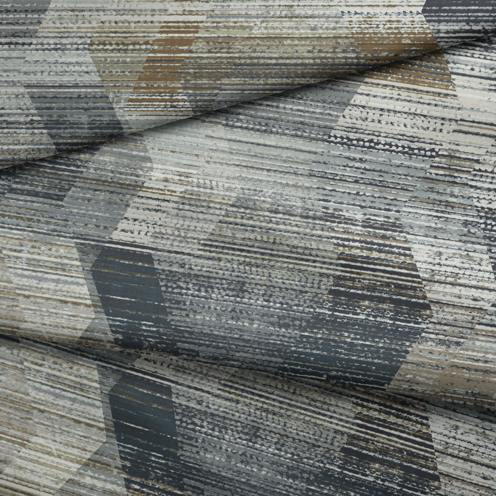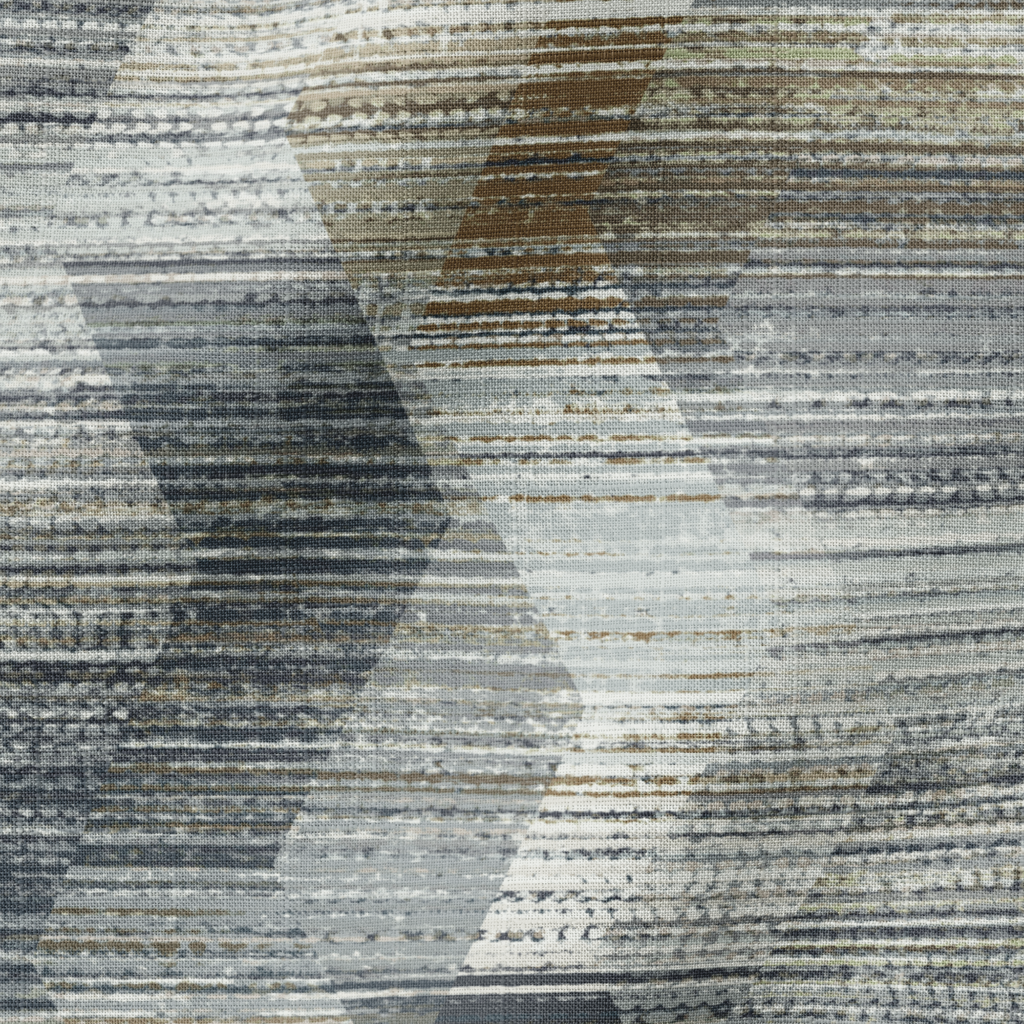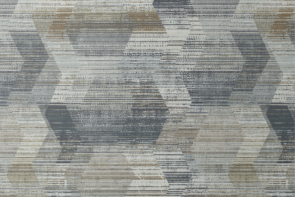 Modern abstract geometric pattern in weathered gray, blue, and beige tones featuring distressed horizontal lines and overlapping hexagons for a sophisticated contemporary look.