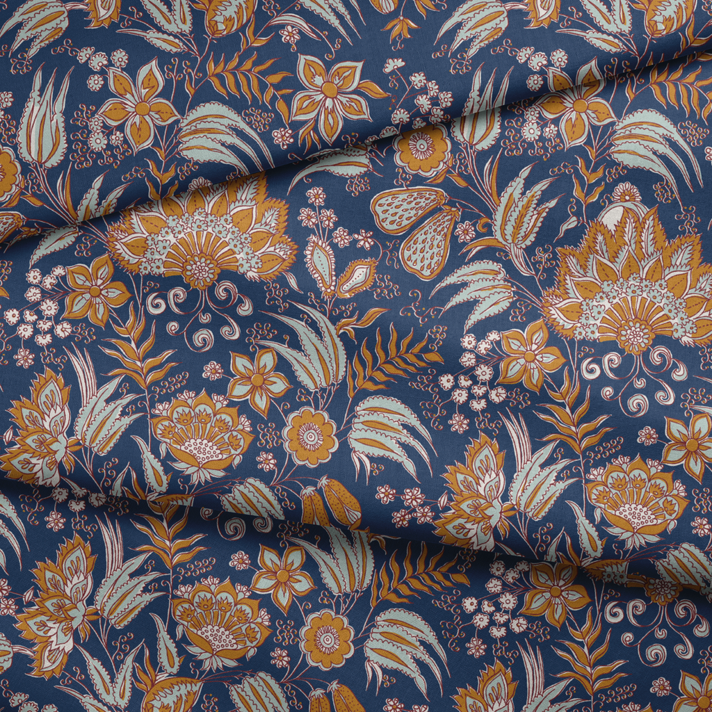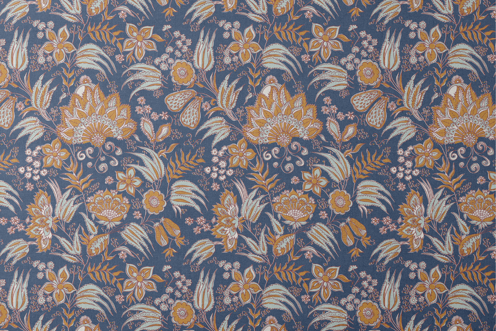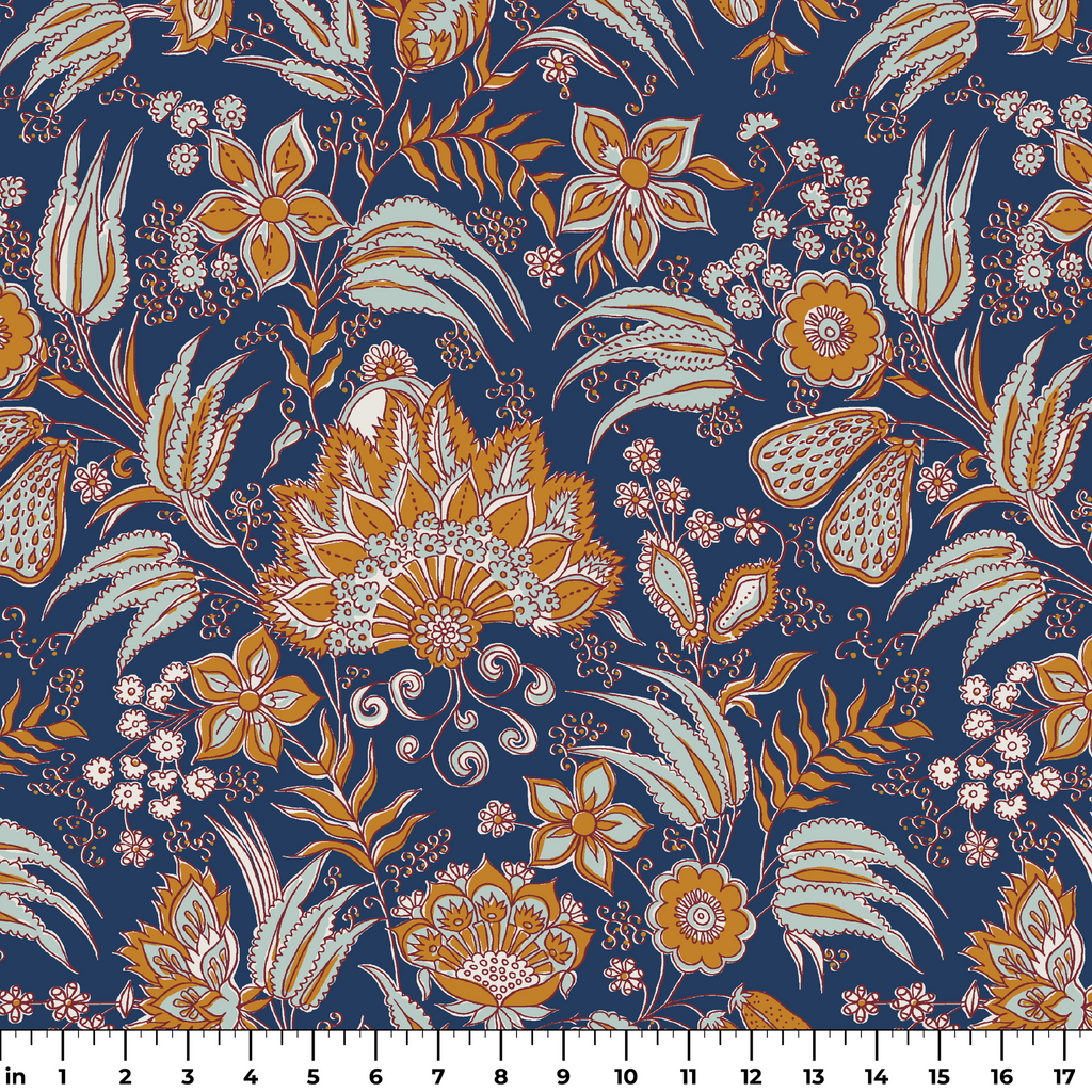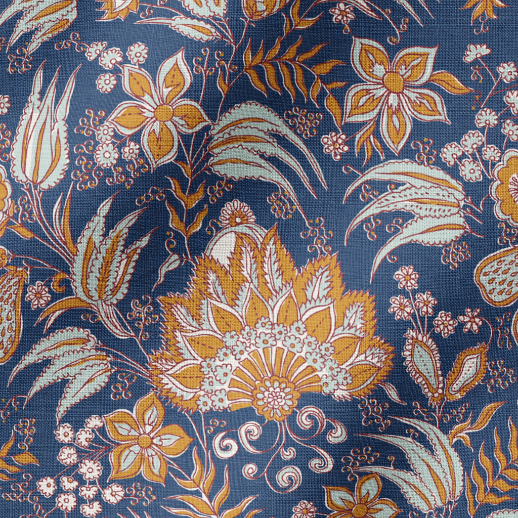 Elegant botanical pattern featuring intricate paisley designs and stylized florals in muted orange and pale blue on a deep blue background. Perfect for traditional flair with a heritage-inspired aesthetic.
