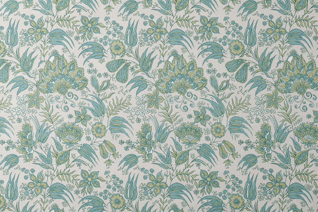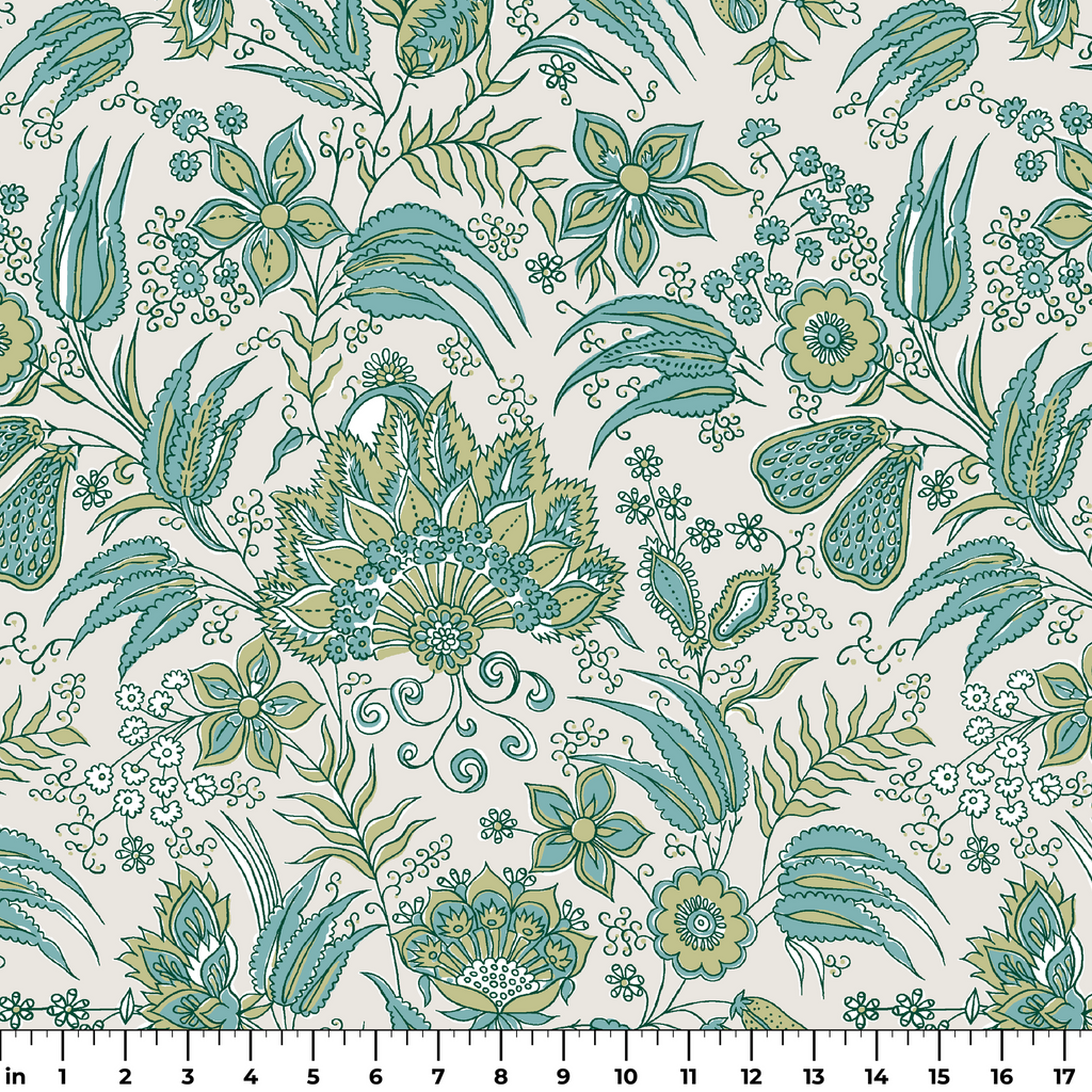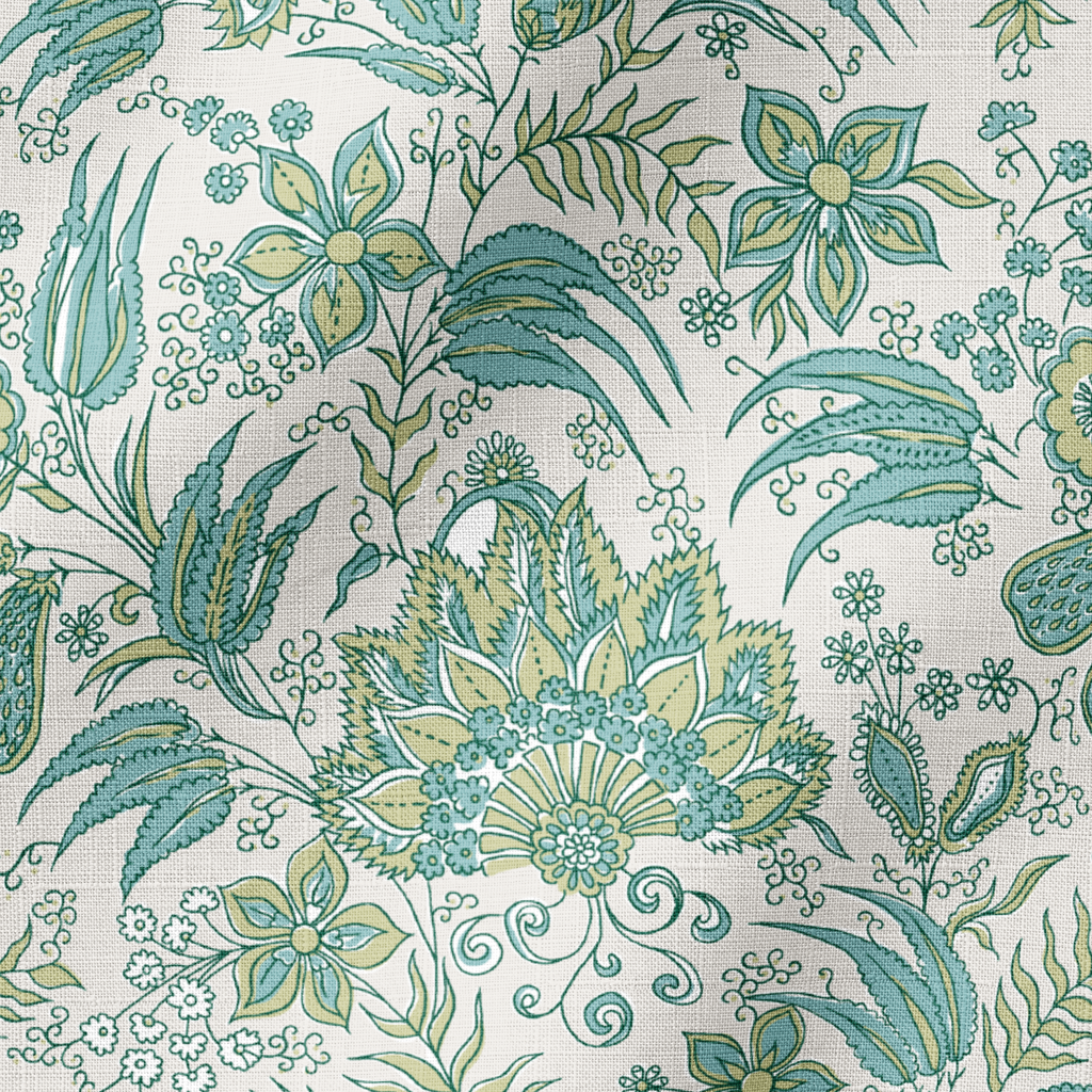 Elegant botanical pattern featuring intricate paisley designs and stylized florals in muted green and teal on a cream background. Perfect for traditional flair with a heritage-inspired aesthetic.