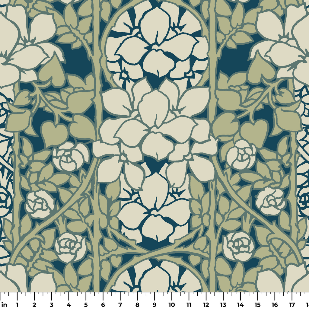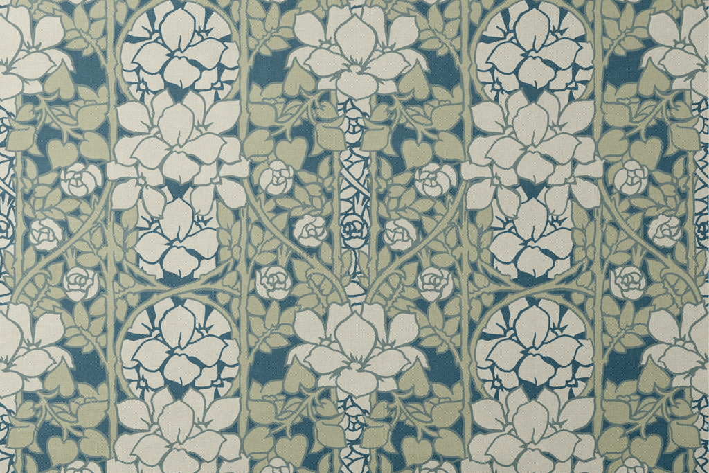 Elegant Art Nouveau floral pattern featuring beige botanical motifs with stylized roses and leaves on a blue background, perfect for a vintage-inspired touch.