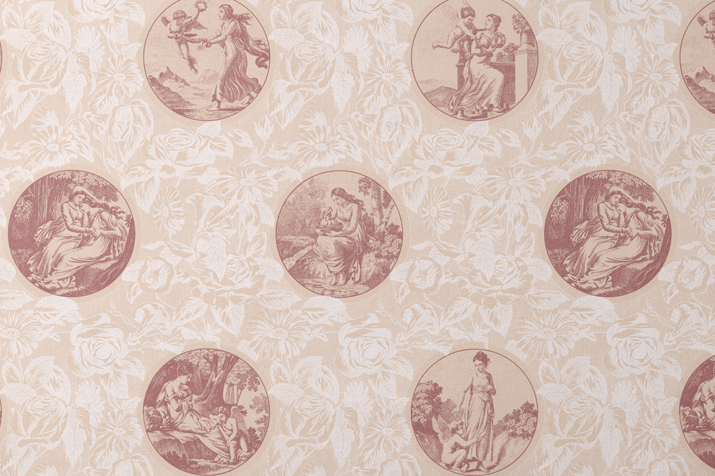 Elegant classical-inspired design featuring mythological scenes in circular medallions on a soft peach floral background, perfect for adding timeless sophistication to interior spaces.