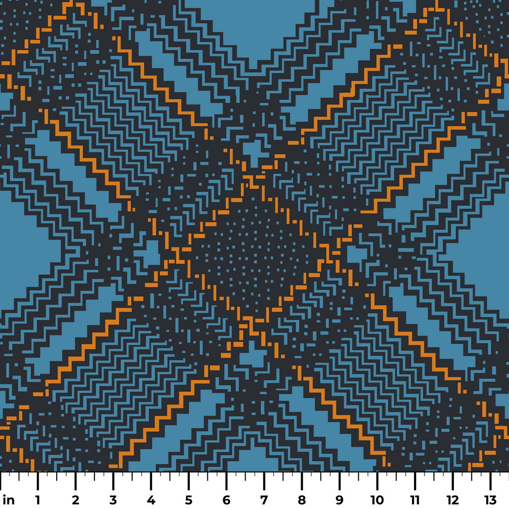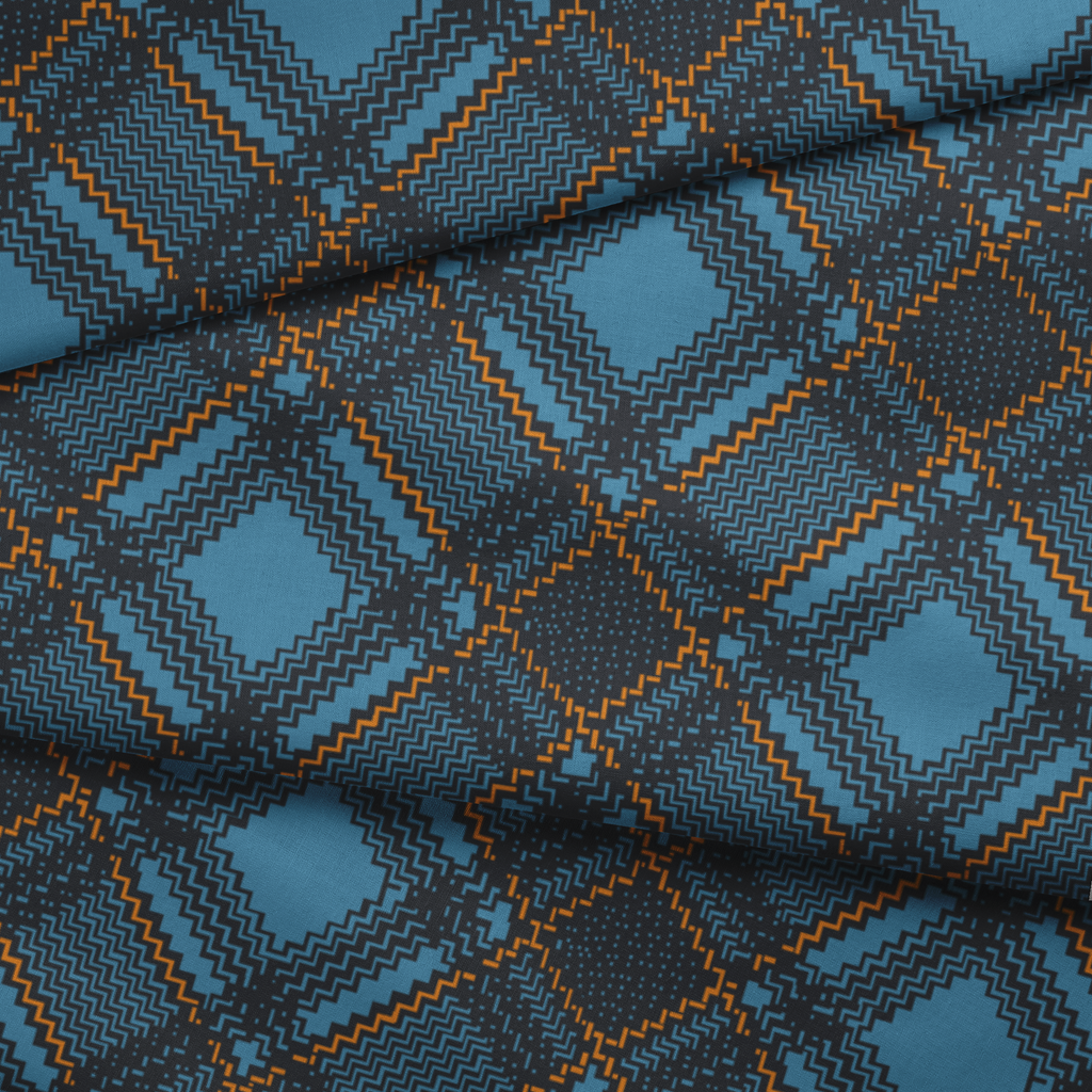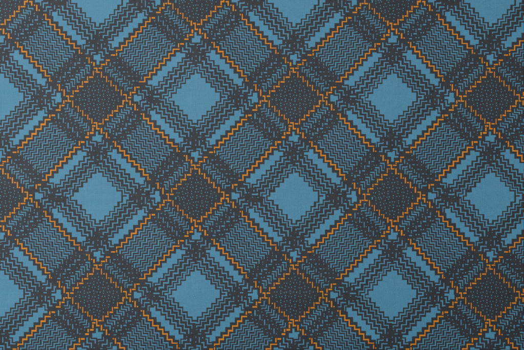 This stylish geometric pattern features a classic tartan-inspired design with zigzag textures on a bold, blue background with brown and orange accents, creating a timeless plaid motif.