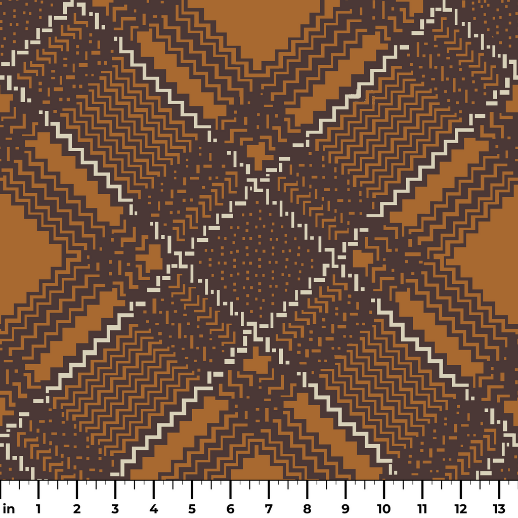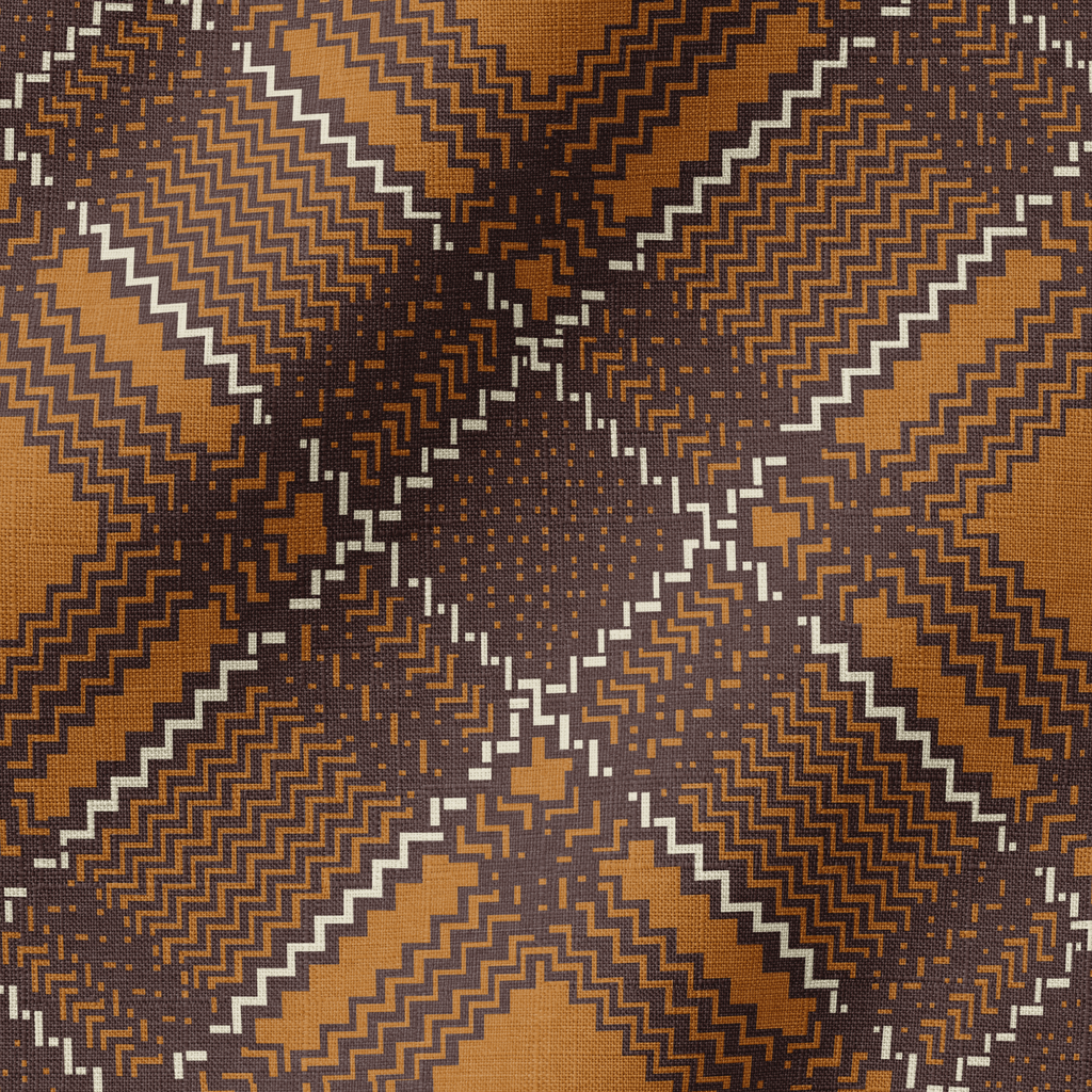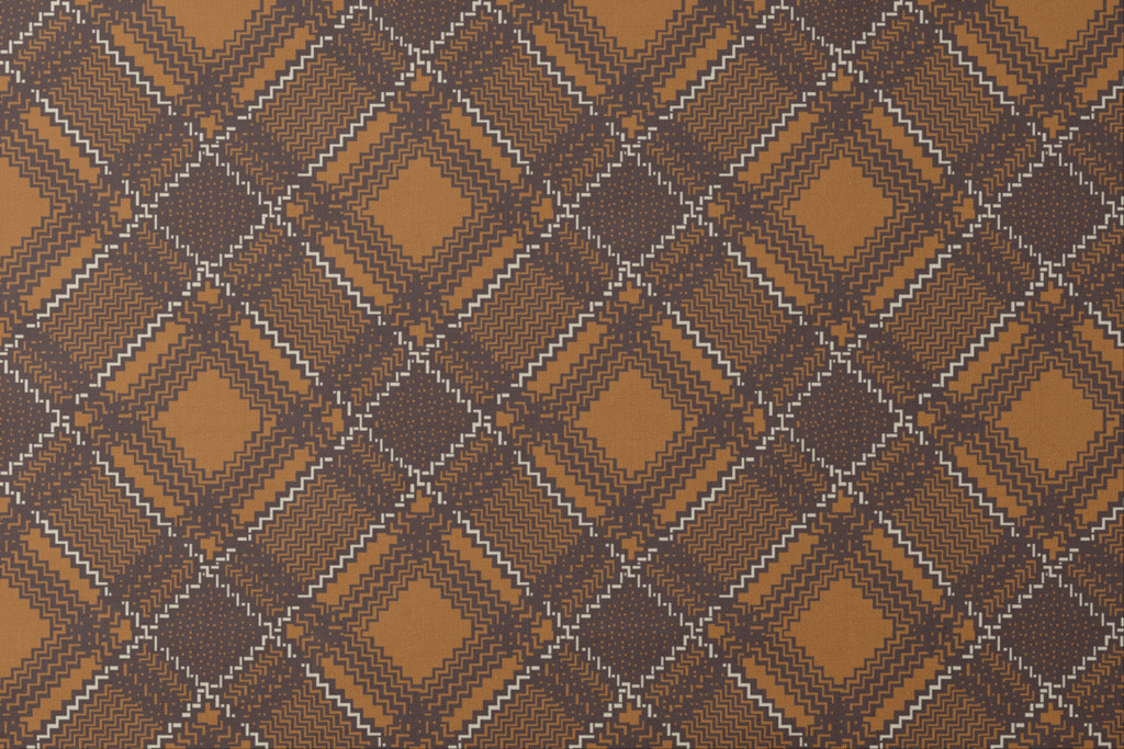This stylish geometric pattern features a classic tartan-inspired design with zigzag textures in caramel tones of orange and brown, creating a timeless plaid motif.