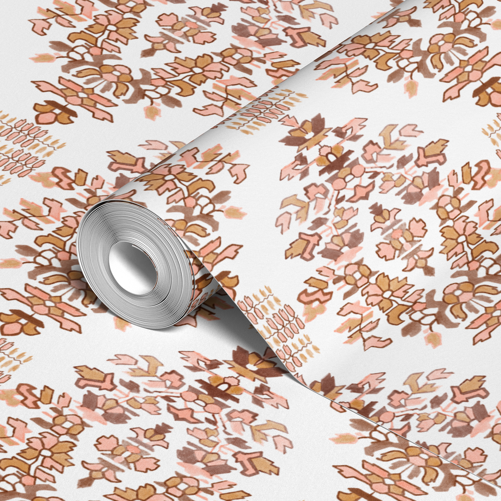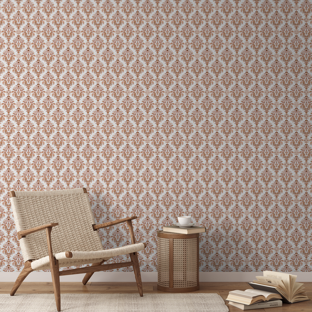 Elegant damask pattern in copper and cream tones creates a sophisticated, traditional look with ornate medallions and flowing botanical motifs, perfect for any space.