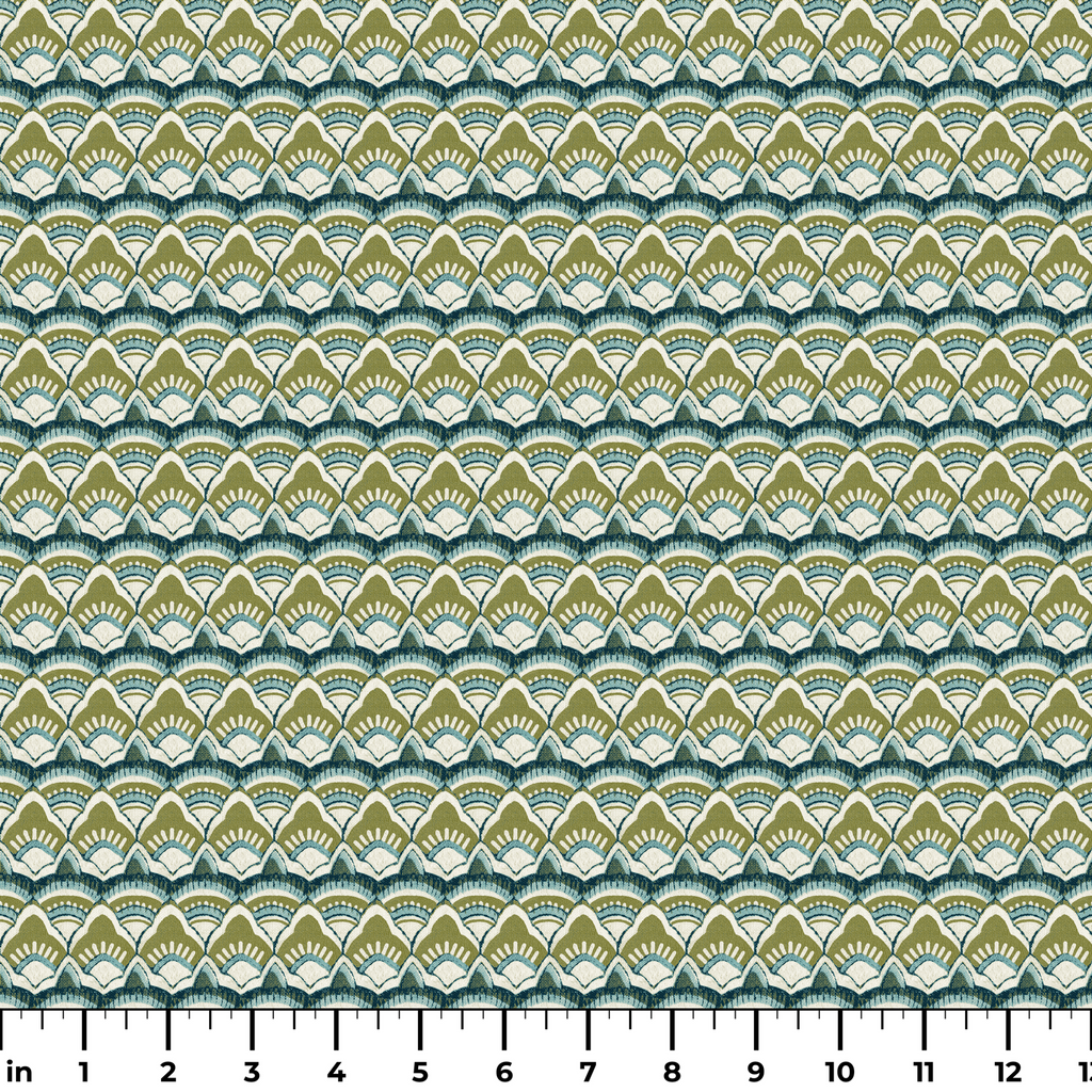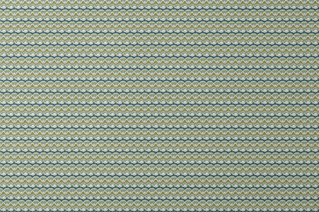 Elegante patrón Art Deco en tonos de verde oliva, azul y crema, con diseño escamado que evoca un estilo vintage y sofisticado, perfecto para decoración interior o textiles de hogar.