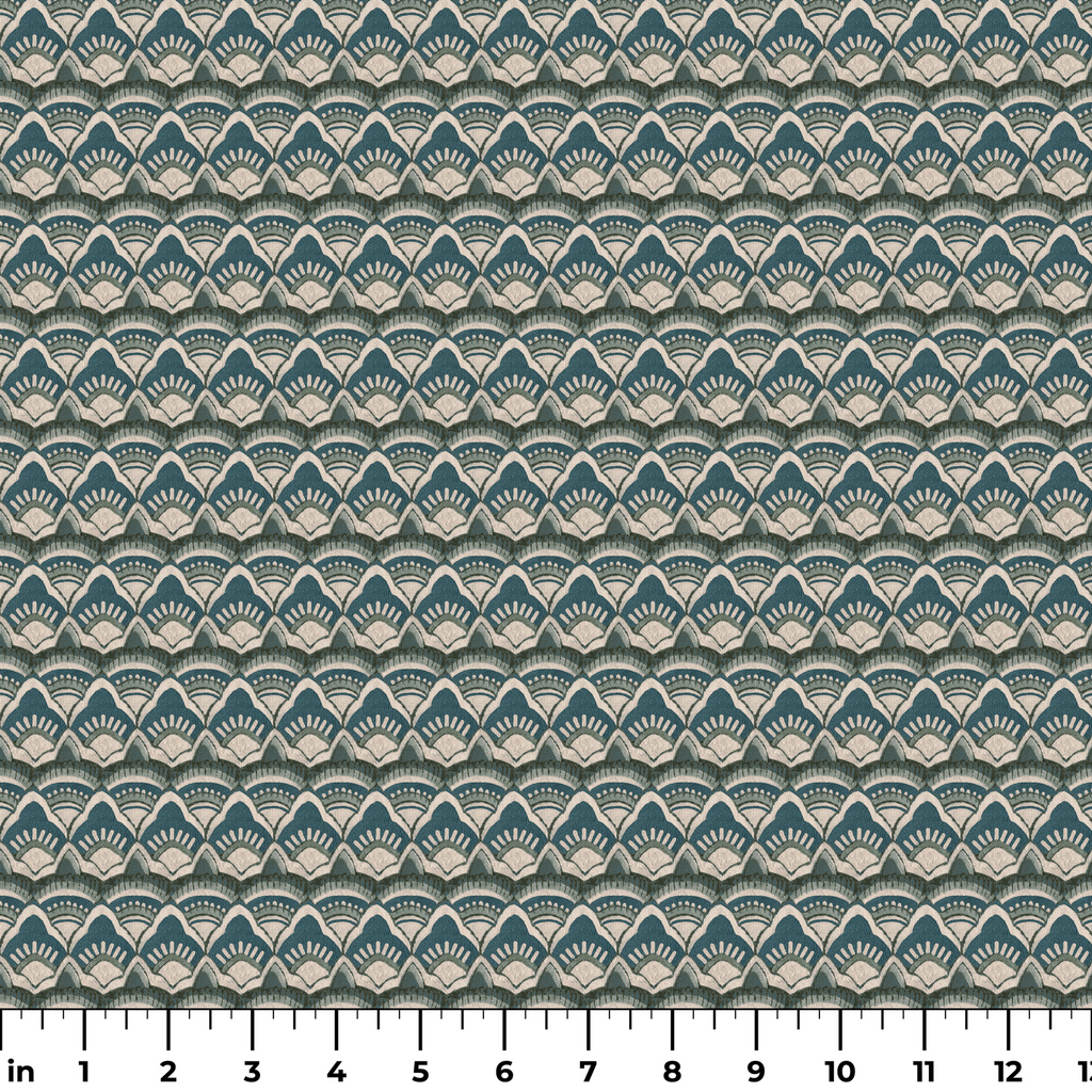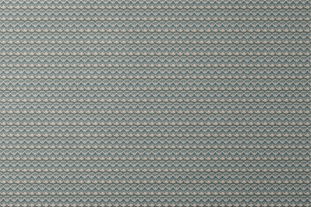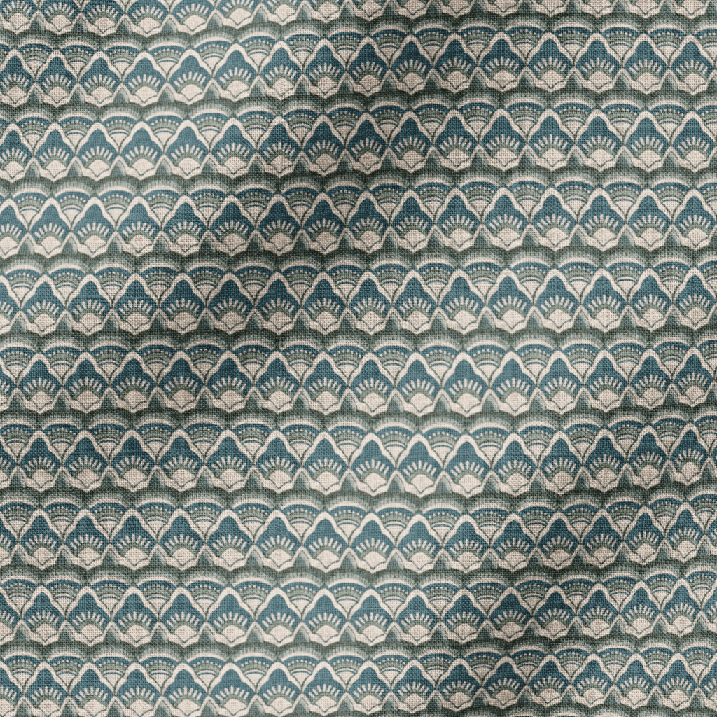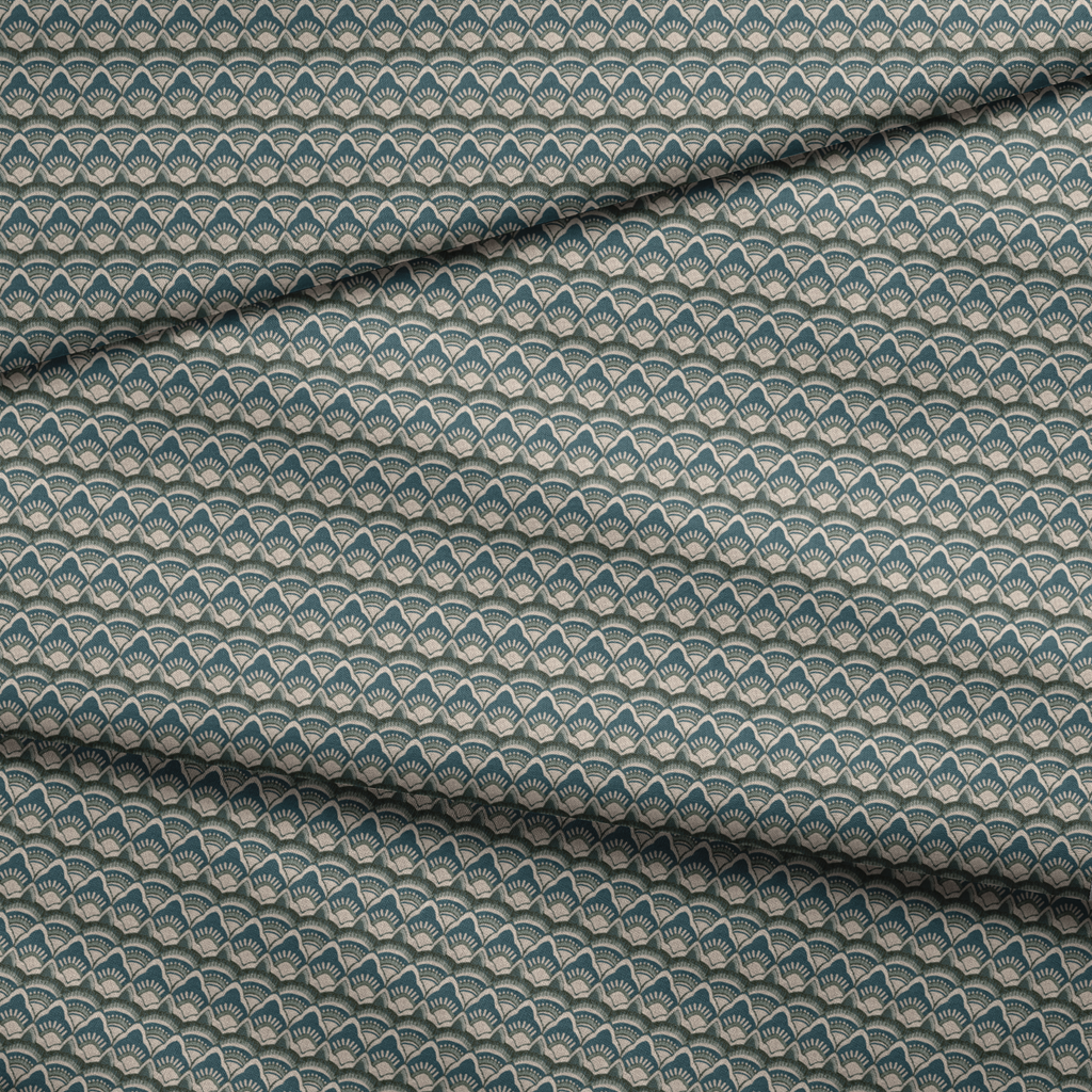 Elegant Art Deco-inspired pattern with overlapping oval motifs in green, blue, and gray tones. Perfect for a sophisticated vibe for your home with its timeless geometric design and vintage appeal.
