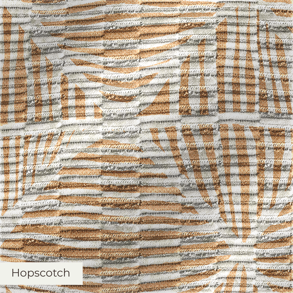 A bold, playful upholstery fabric with raised rectangular accents and subtle sheen. Hopscotch offers a modern architectural feel. Its tactile surface, durability, and design selection make it ideal for statement home decor pieces.
