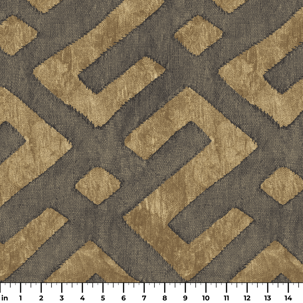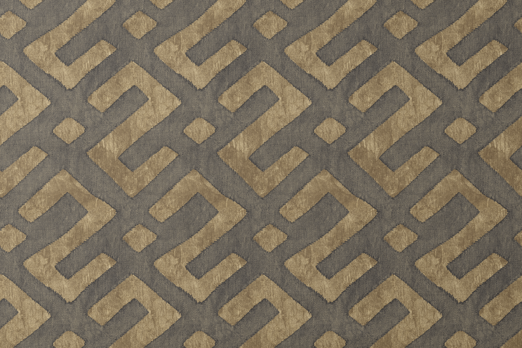This elegant gray and gold geometric design features a traditional tribal motif with interlocking angular shapes, creating a sophisticated pattern perfect for upholstery or home decor accents.