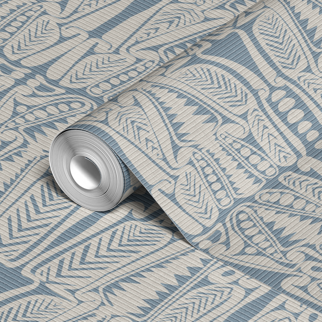 Elegant tribal-inspired design featuring stylized geometric patterns in blue and cream. The symmetrical layout with feather motifs and dotted path creates a sophisticated heritage look perfect for any home.