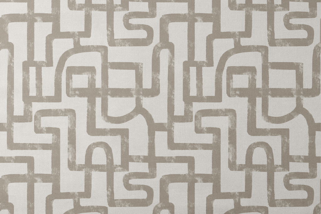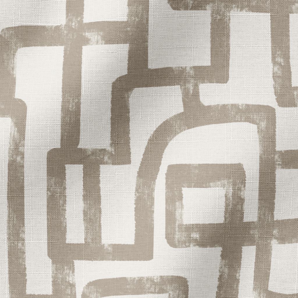 Modern geometric maze pattern in taupe on a cream background. This contemporary design features textured, distressed lines forming an elegant labyrinth of connected pathways.