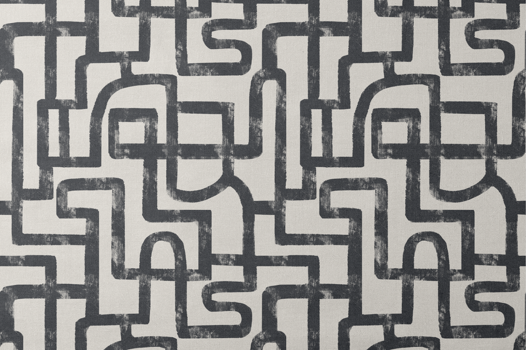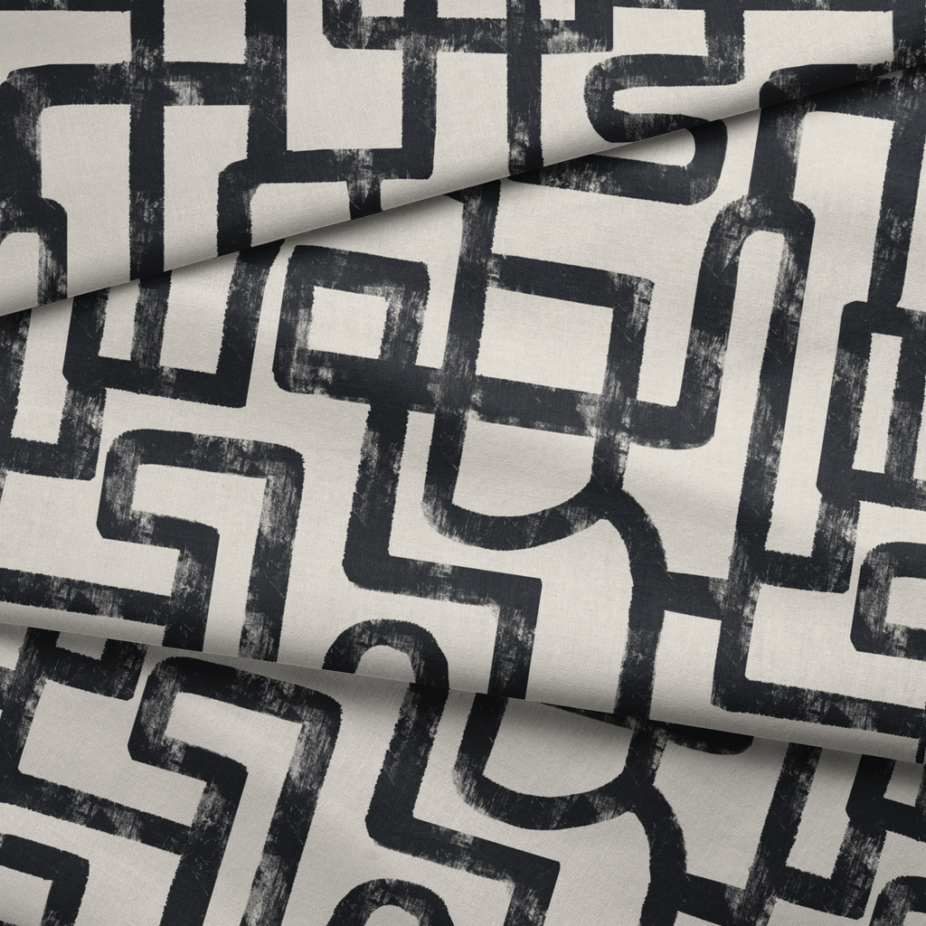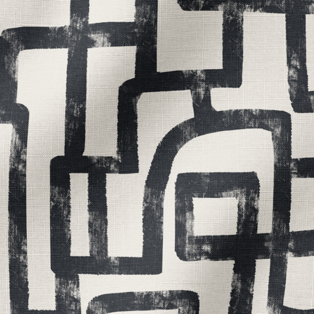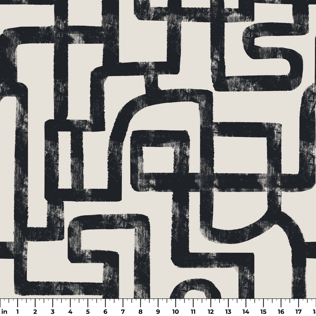 Modern geometric maze pattern in bold black on a cream background. This contemporary design features textured, distressed lines forming an elegant labyrinth of connected pathways.