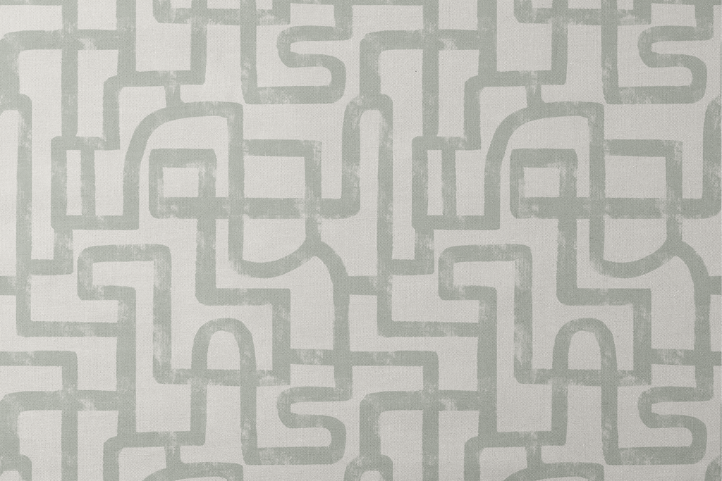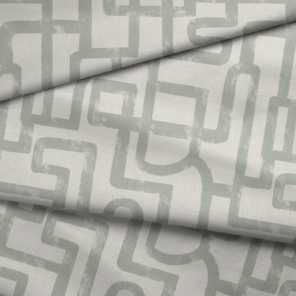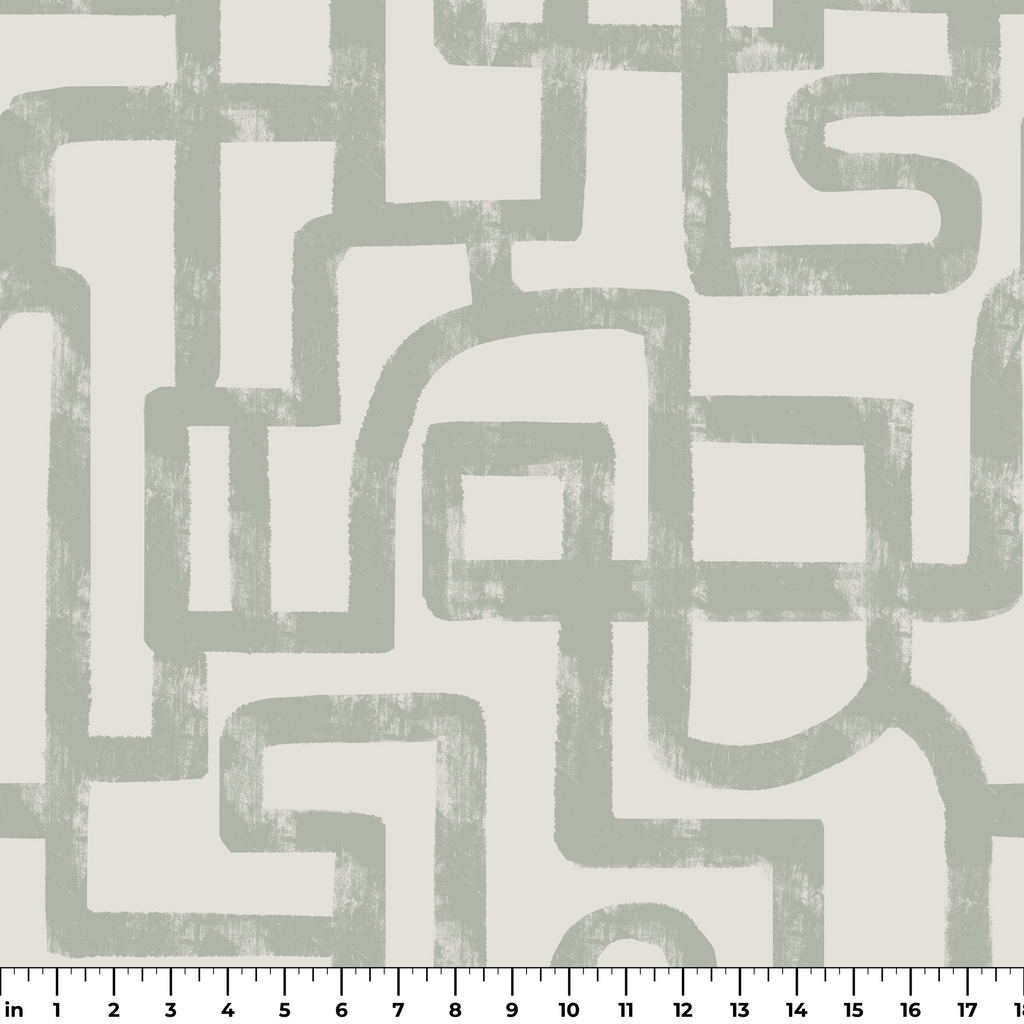 Modern geometric maze pattern in soft sage green on a cream background. This contemporary design features textured, distressed lines forming an elegant labyrinth of connected pathways.