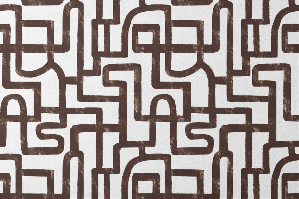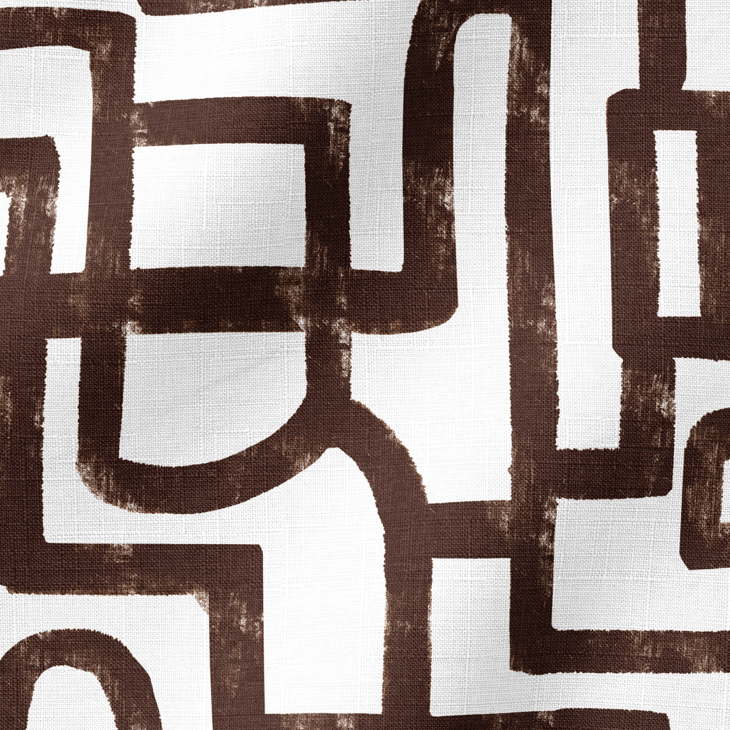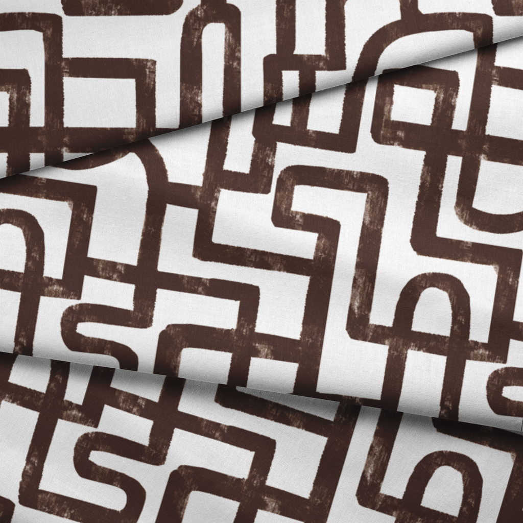 Bold geometric pattern in rich brown featuring an abstract maze of interlocking lines and curves on a crisp white background.