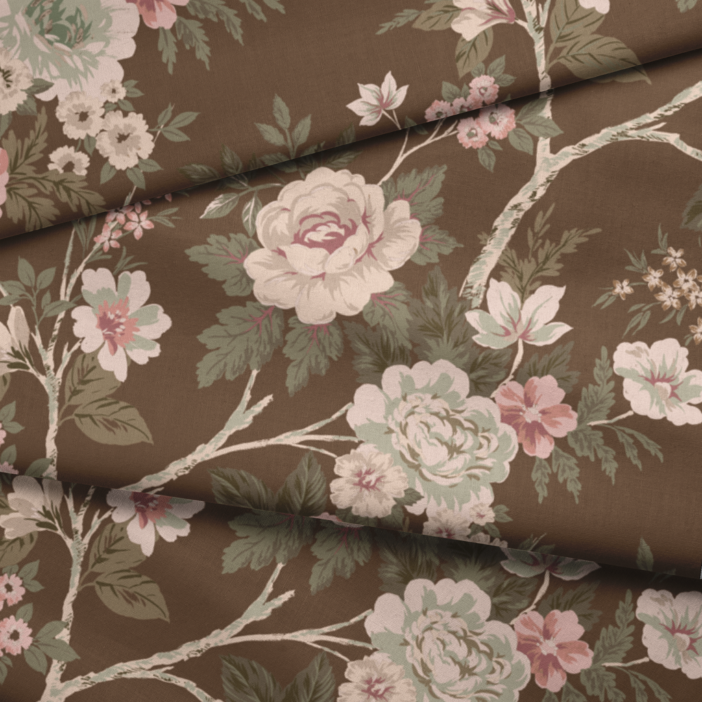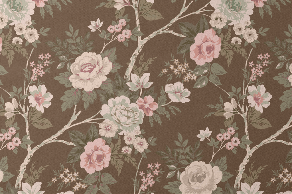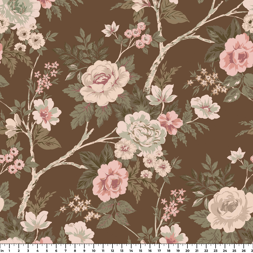 Elegant vintage-inspired floral pattern featuring delicate roses and leafy foliage on a deep brown background.