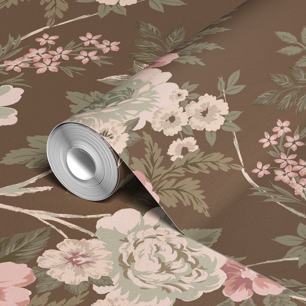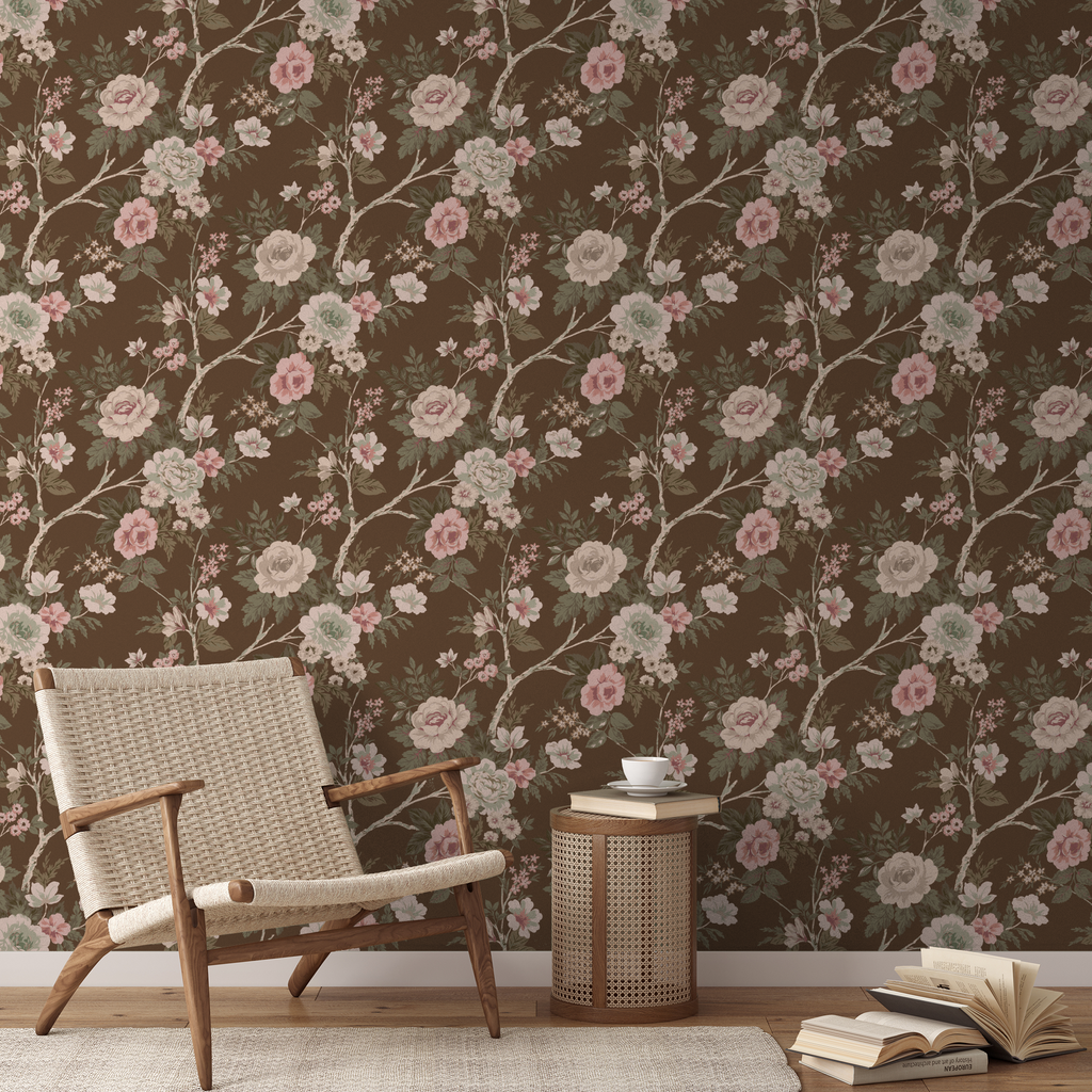 Elegant floral pattern with delicate pink and white roses on a rich chocolate brown background, featuring a vintage botanical design with trailing branches and soft blooms.