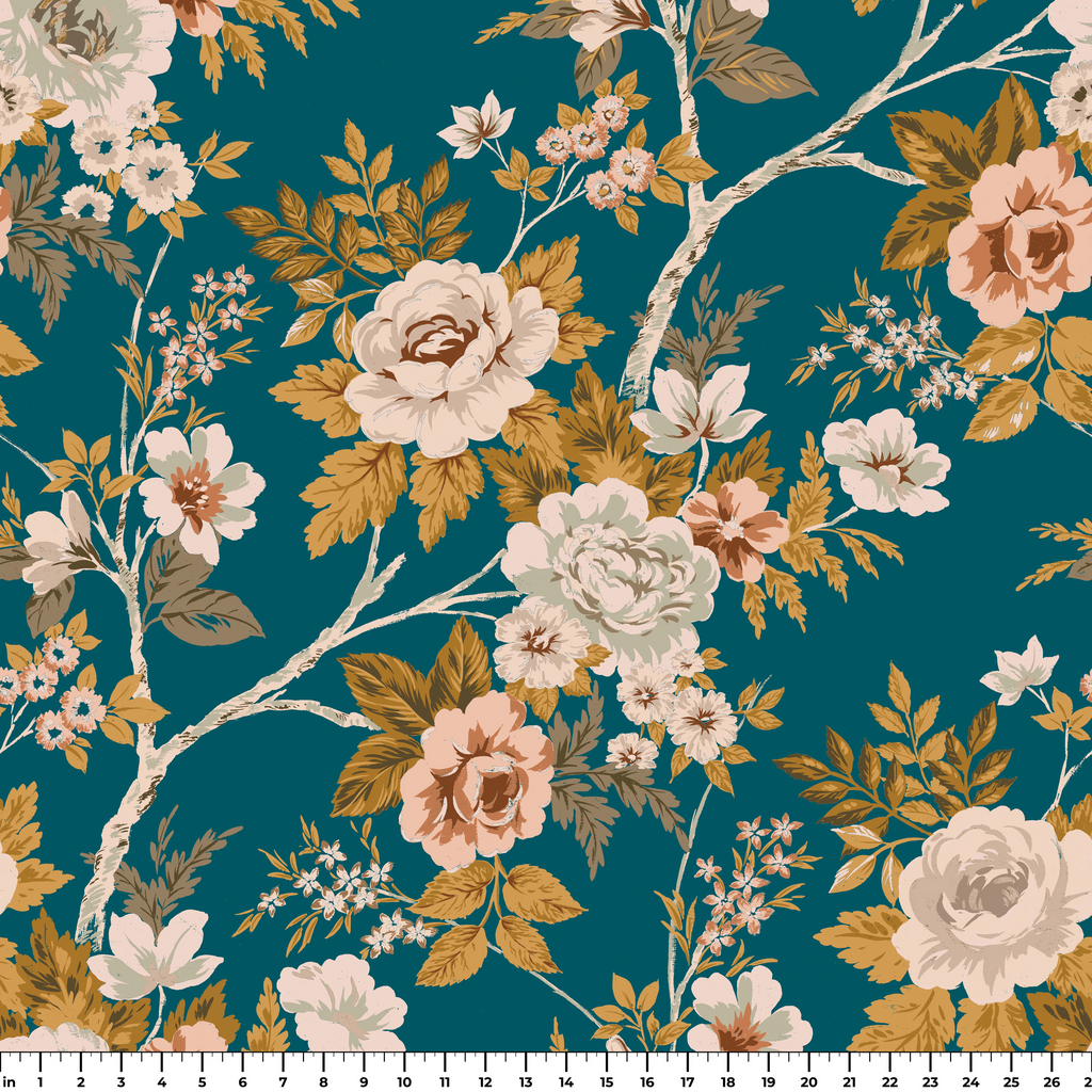 Elegant vintage-inspired floral pattern featuring delicate roses and leafy foliage on a deep teal background.