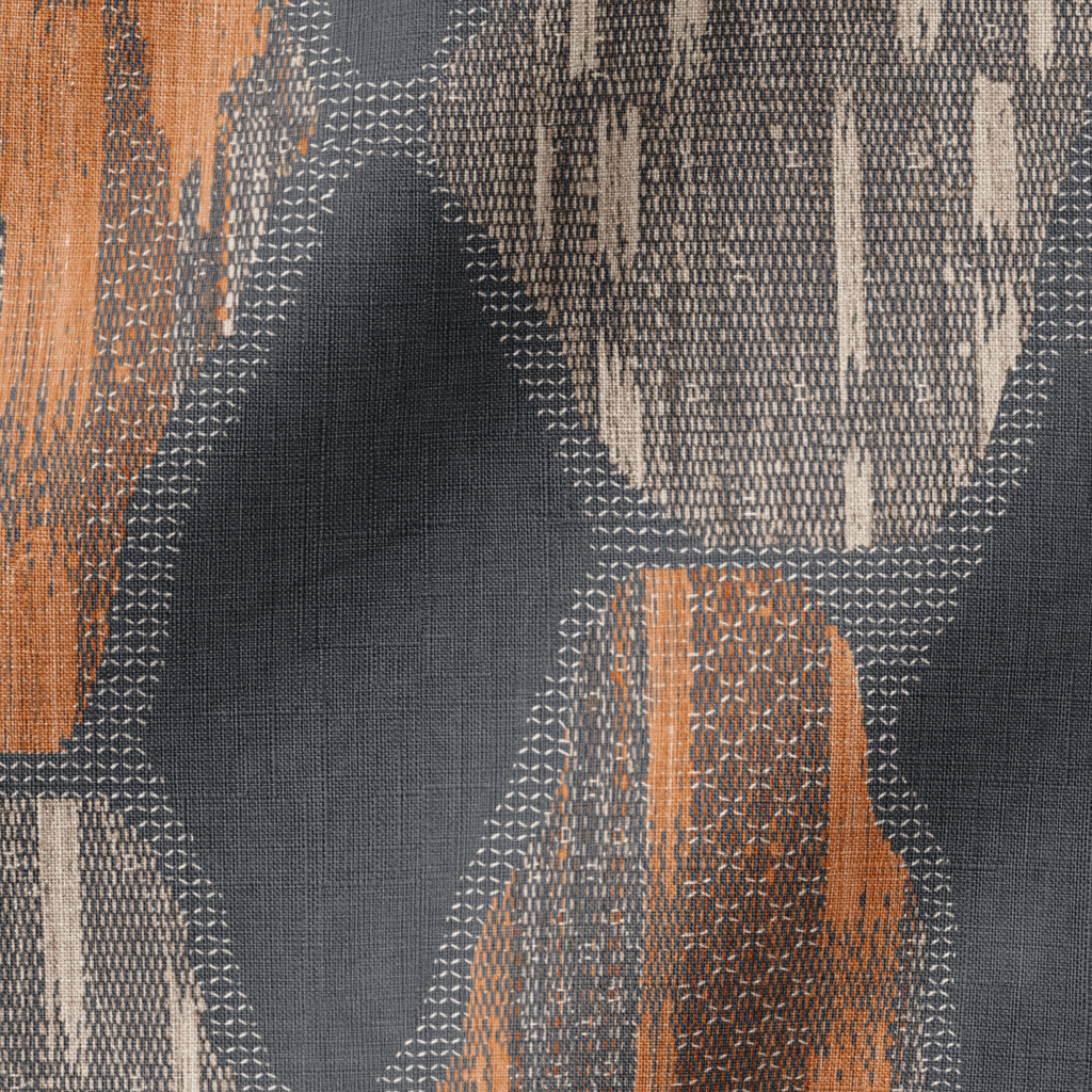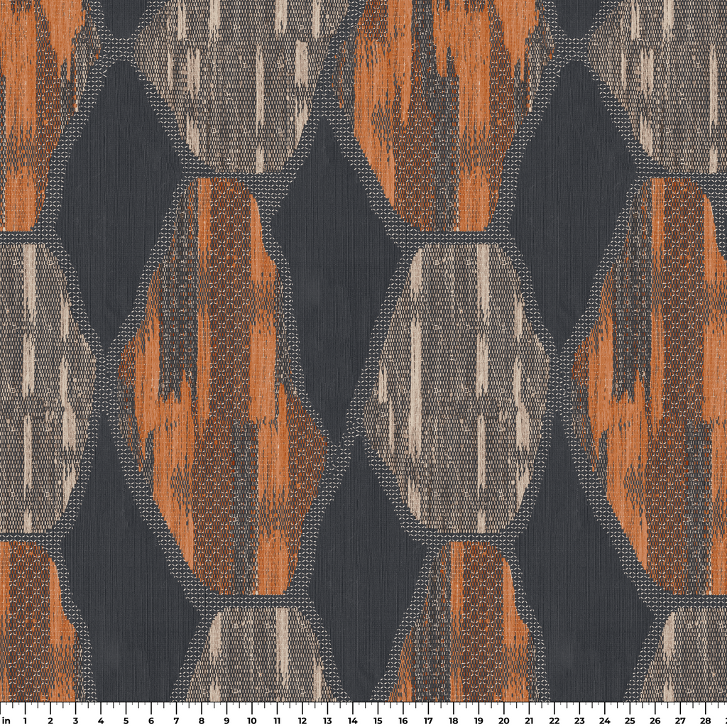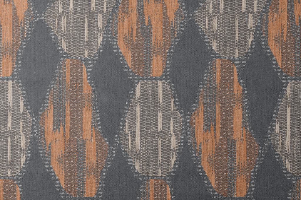 Striking abstract geometric pattern in rich orange, black, and gray tones creates a bold, contemporary design with textured diamond shapes and organic forms.