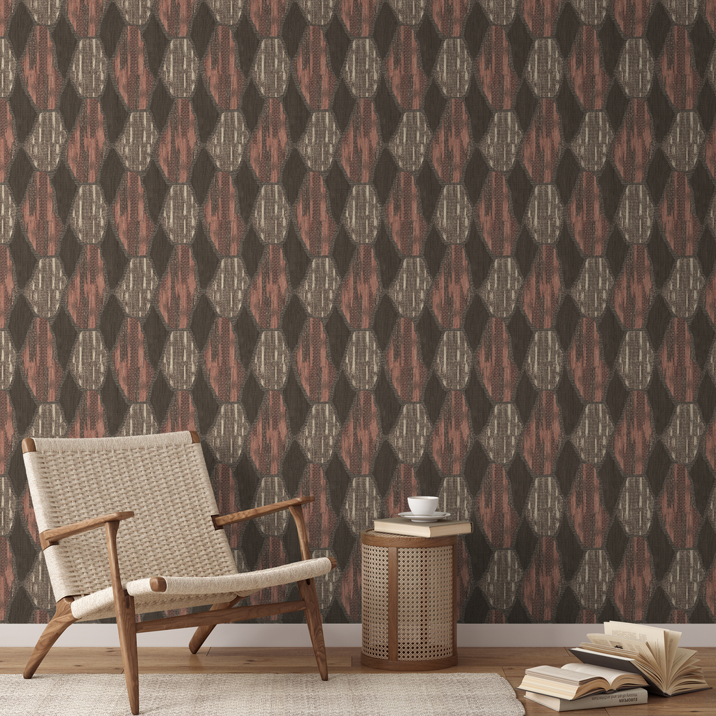 Striking abstract geometric pattern in muted brown, salmon, and gray tones creates a bold, contemporary design with textured diamond shapes and organic forms.