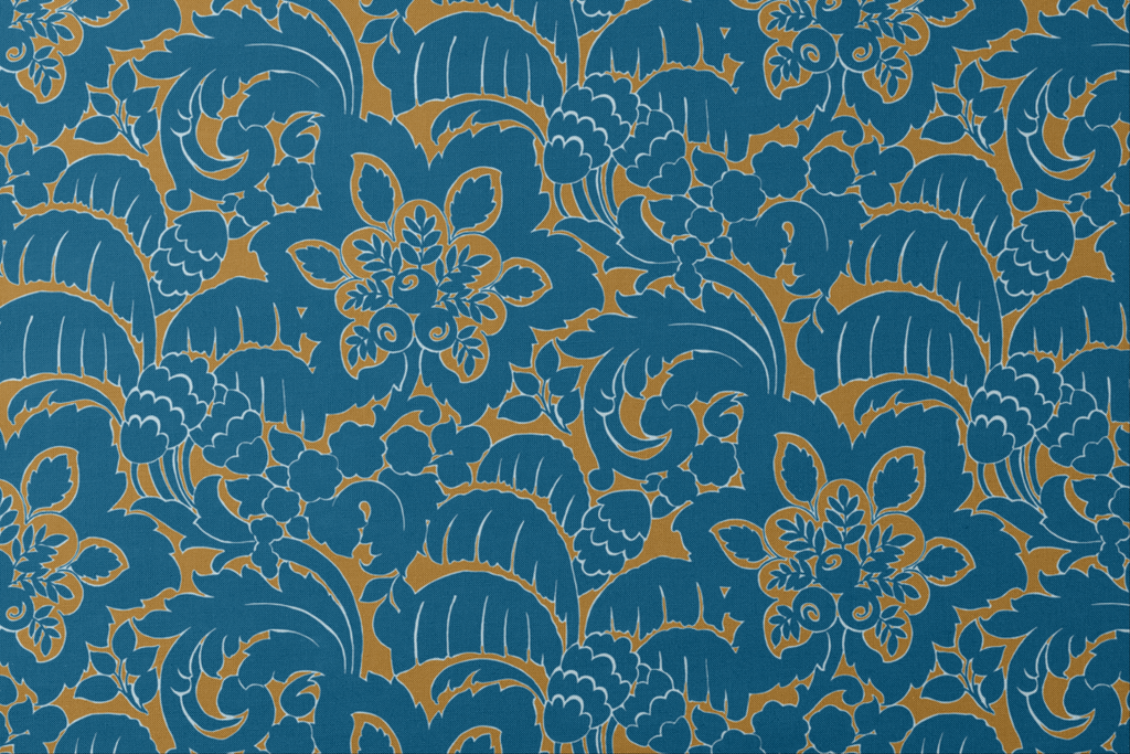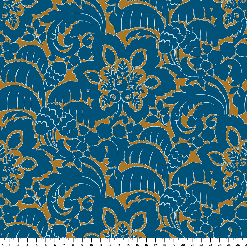 Elegant vintage botanical pattern featuring large stylized leaves and floral motifs in a bold yet sophisticated blue and orange color palette. Perfect for modern and traditional aesthetics.