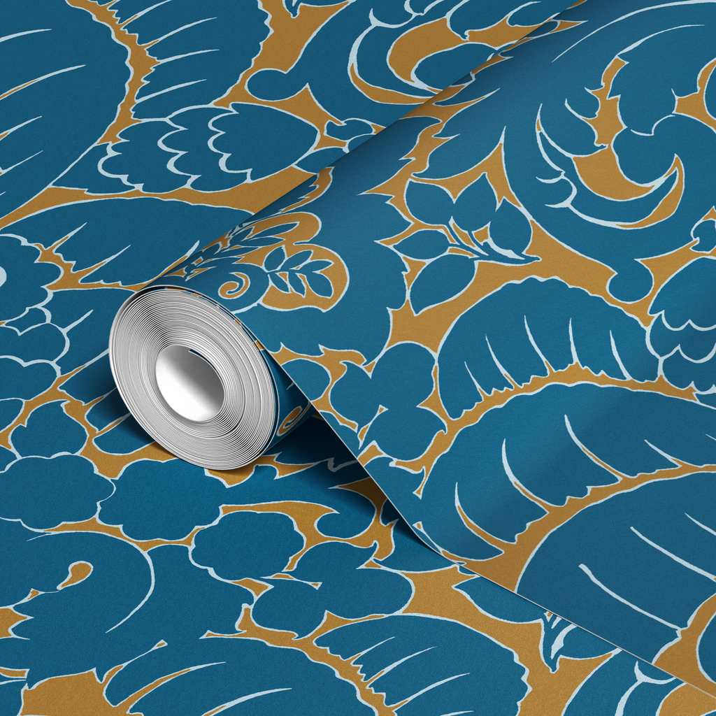 Elegant blue and gold damask pattern featuring intricate floral and botanical motifs. This traditional heritage design showcases flowing curves and organic forms with a sophisticated, timeless appeal.