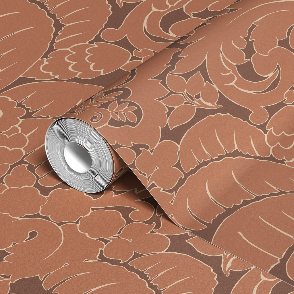 This intricate copper-toned floral pattern blends Art Nouveau curves with traditional damask elements, featuring layered botanical motifs and flowing organic forms in a rich terracotta palette.
