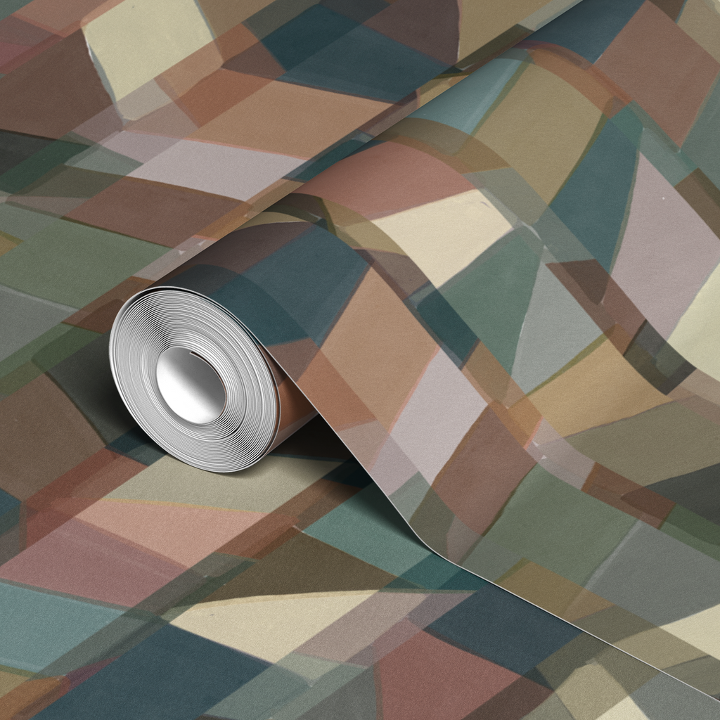 Contemporary geometric pattern in neutral earth tones featuring abstract angular shapes. Modern cubist-inspired design with cream, teal, and brown blocks creates a sophisticated architectural motif.