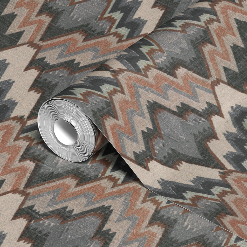 Contemporary geometric zigzag pattern featuring earthy tones of charcoal, beige, and rust, creating a modern tribal look with dynamic chevron motifs perfect for a stylish aesthetic.