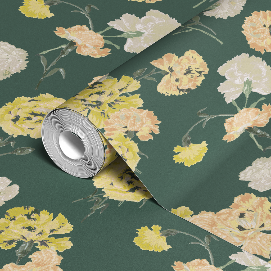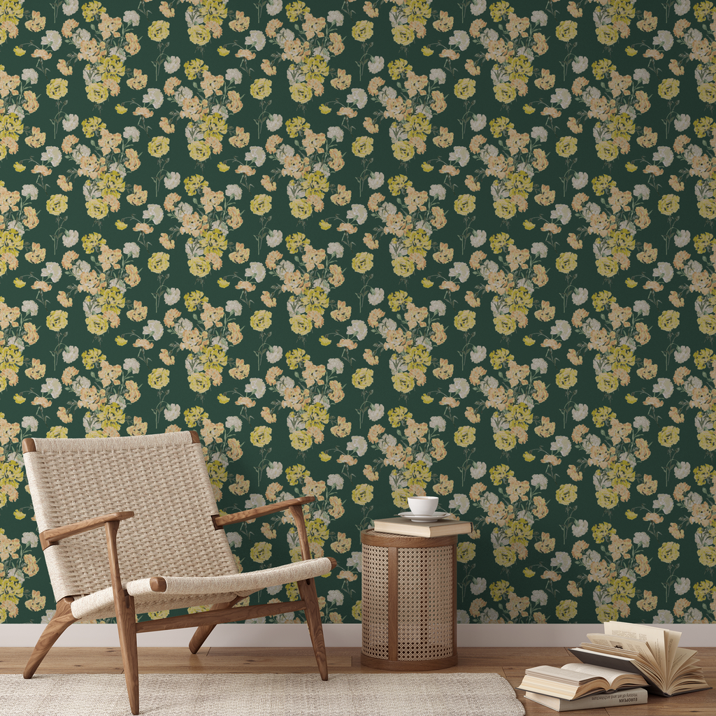 Elegant vintage floral pattern featuring delicate peonies and wildflowers in soft yellow, peach, and ivory against a rich forest green background, perfect for sophisticated home decor.