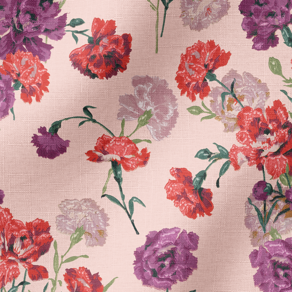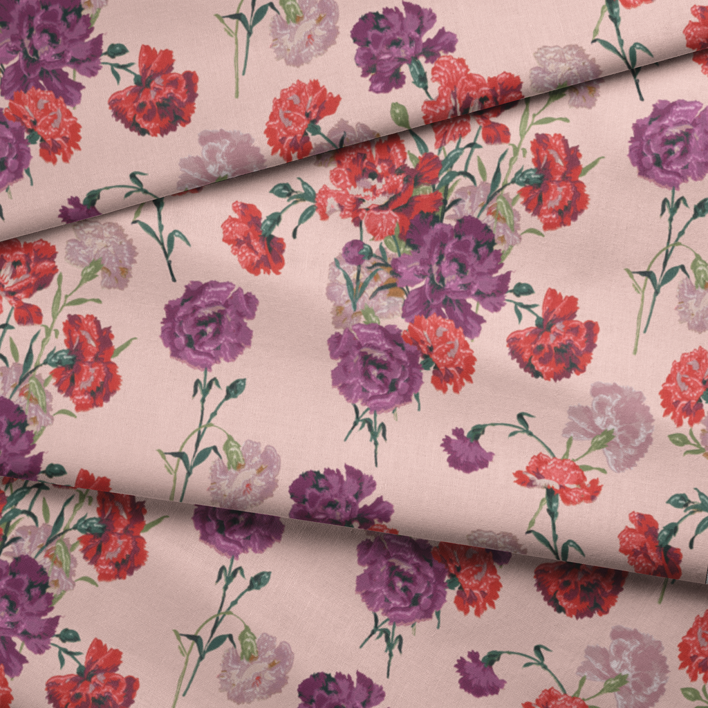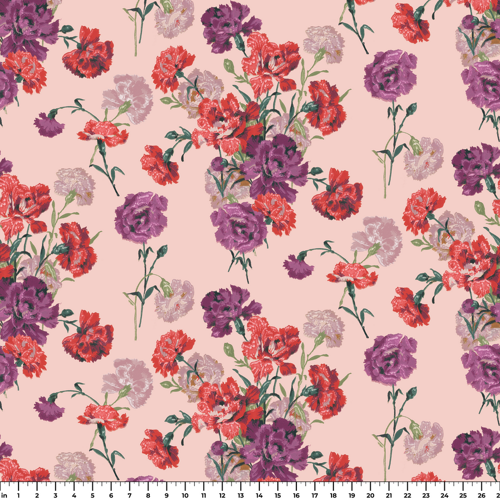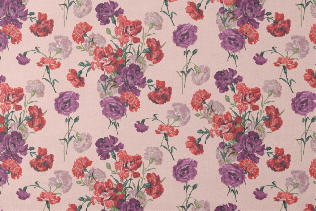 Elegant floral pattern featuring delicate lilac, plum, and red blooms against a soft pink background, perfect for modern to eclectic design aesthetics.