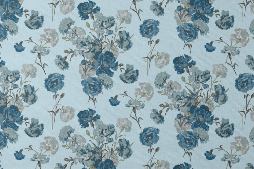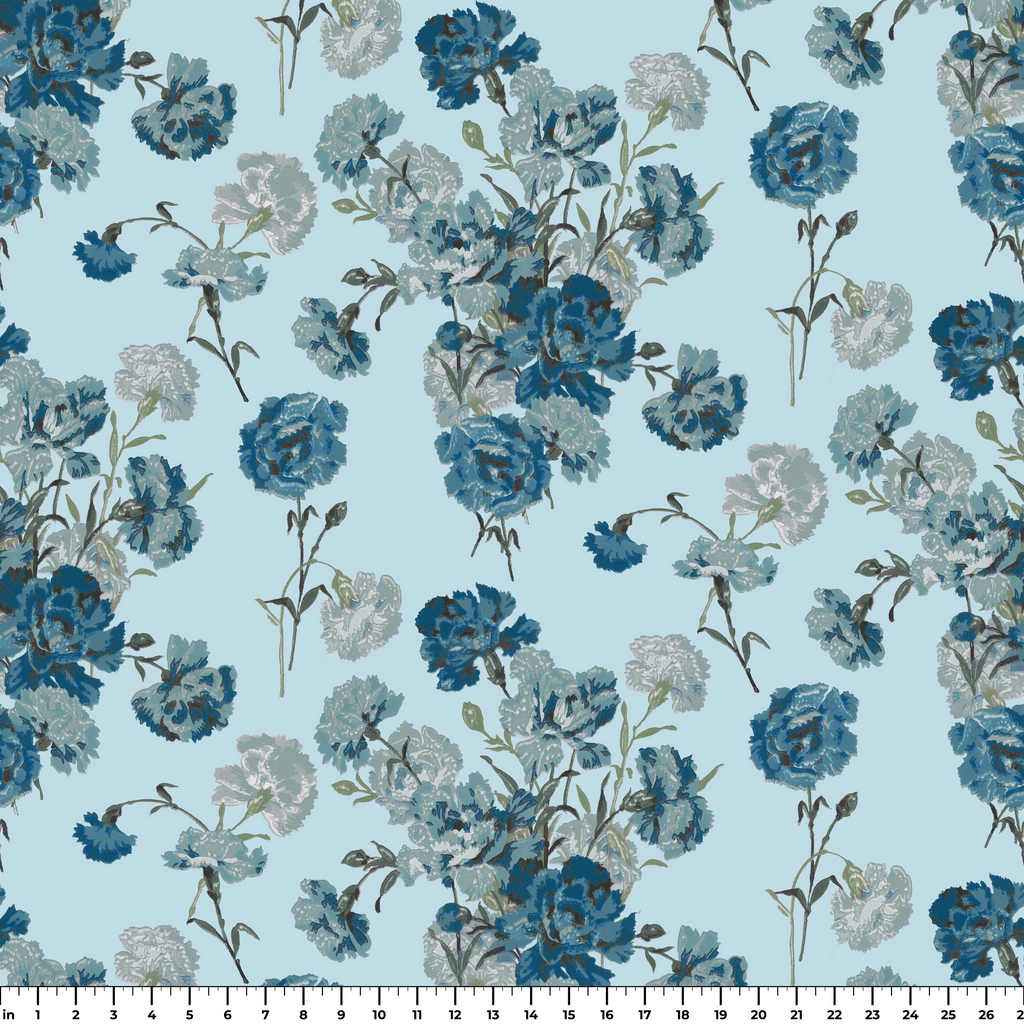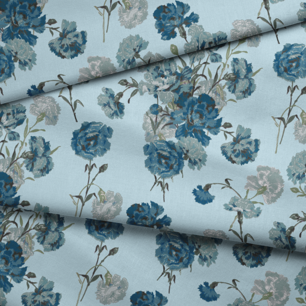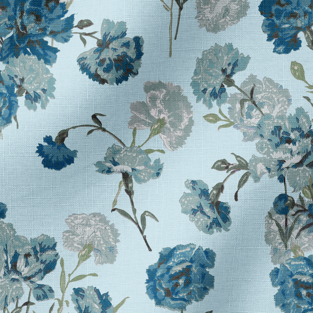 Elegant floral pattern featuring delicate blooms in various shades of blue against a pale cerulean background, perfect for modern to eclectic design aesthetics.