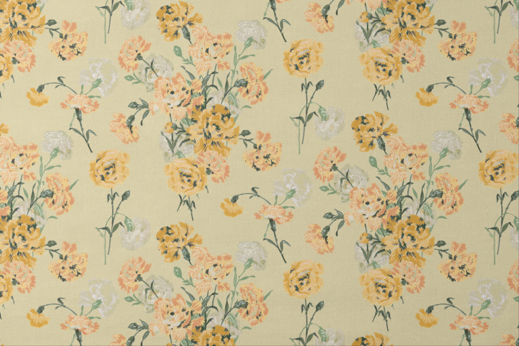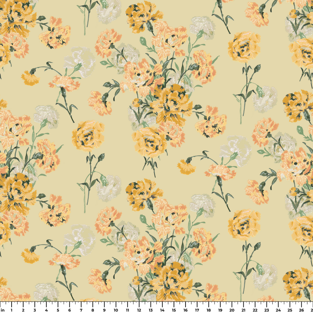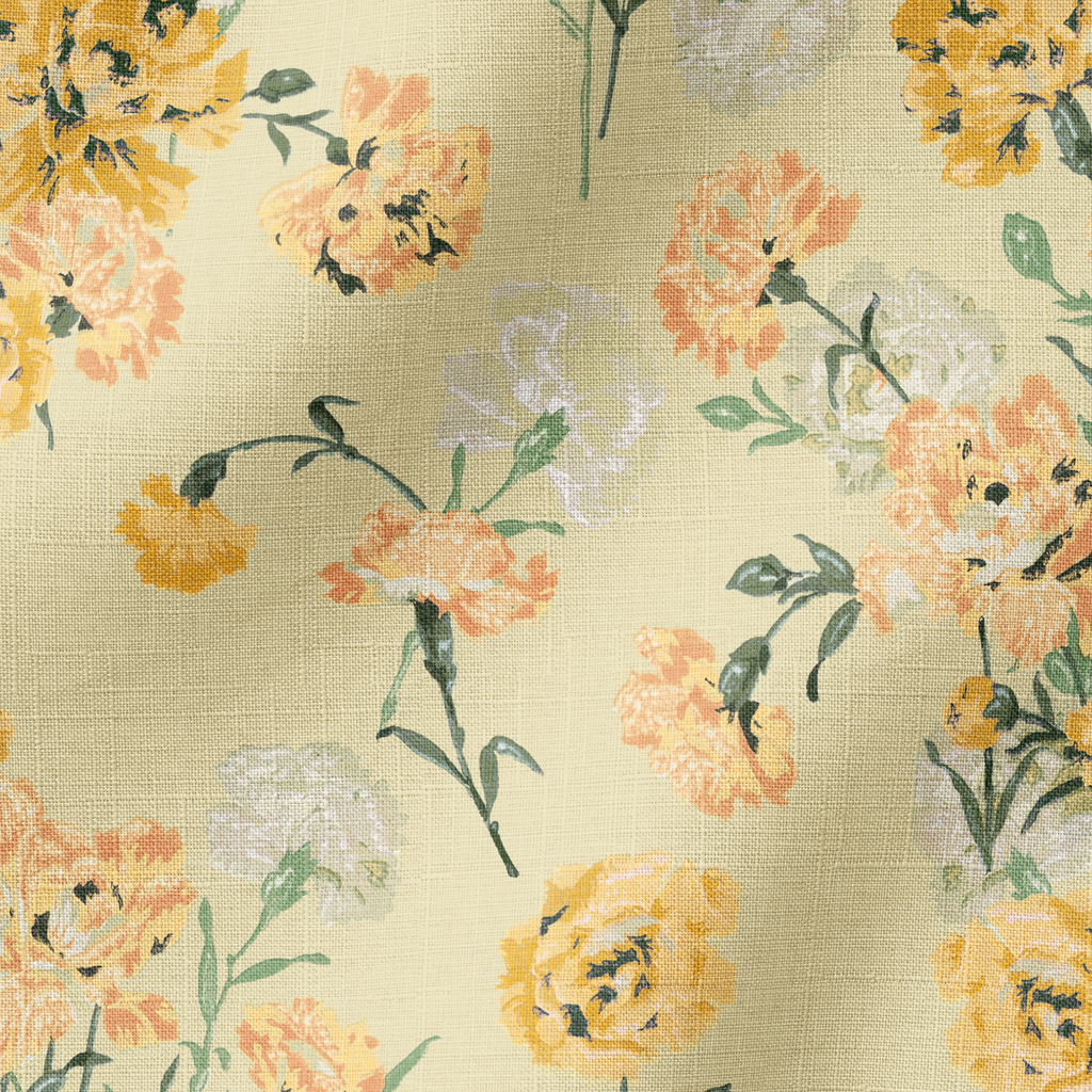 Elegant floral pattern featuring delicate marigold, and white blooms against a soft yellow background, perfect for modern to eclectic design aesthetics.