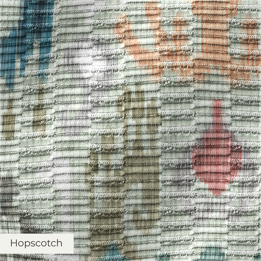 A bold, playful upholstery fabric with raised rectangular accents and subtle sheen. Hopscotch offers a modern architectural feel. Its tactile surface, durability, and design selection make it ideal for statement home decor pieces.