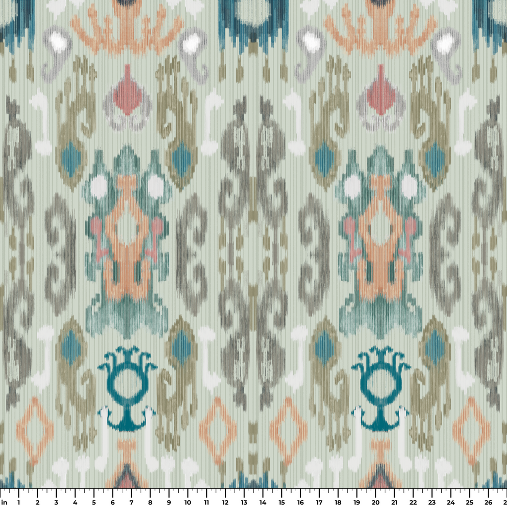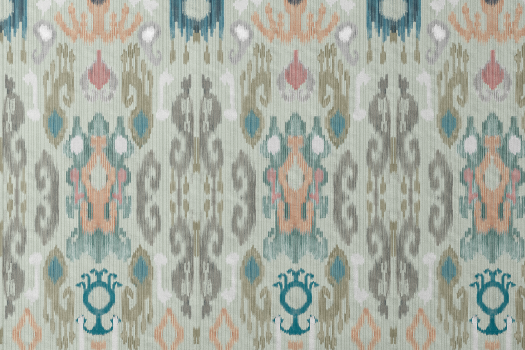 Elegante patrón ikat en tonos suaves de azul, coral y gris, perfecto para decoración de estilo bohemio o global en interiores contemporáneos.