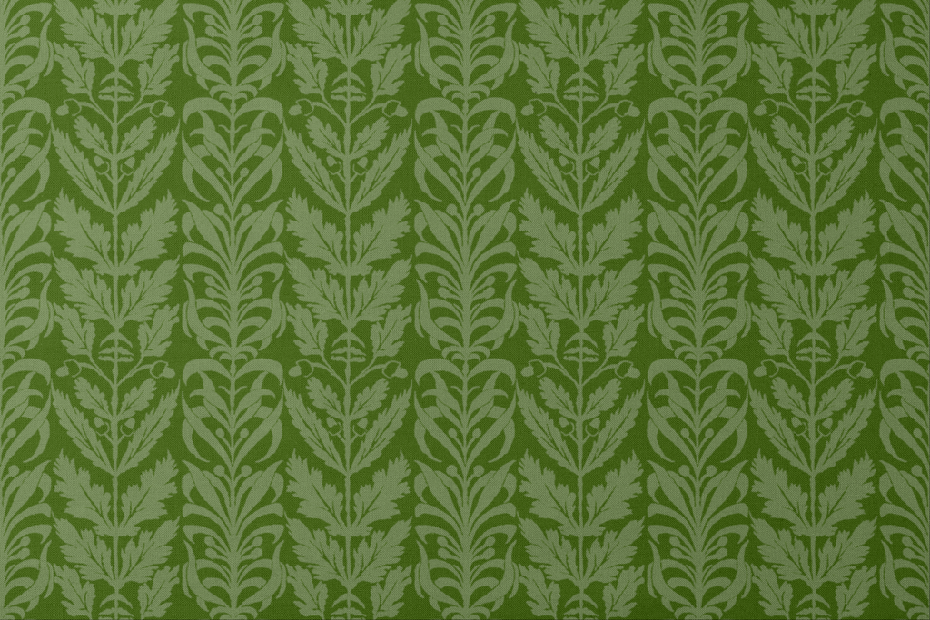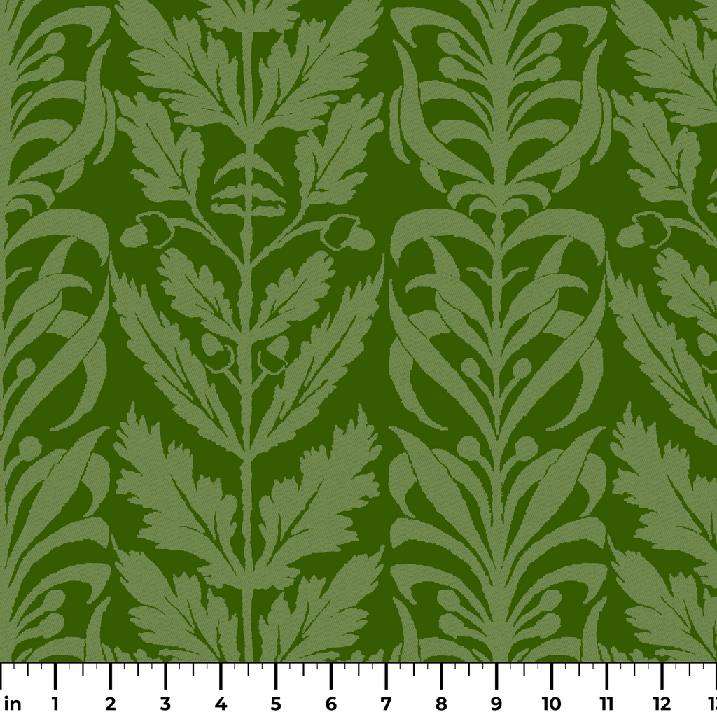 Elegant damask pattern in deep green tones featuring symmetrical leaf motifs with a rich, heritage-inspired aesthetic.