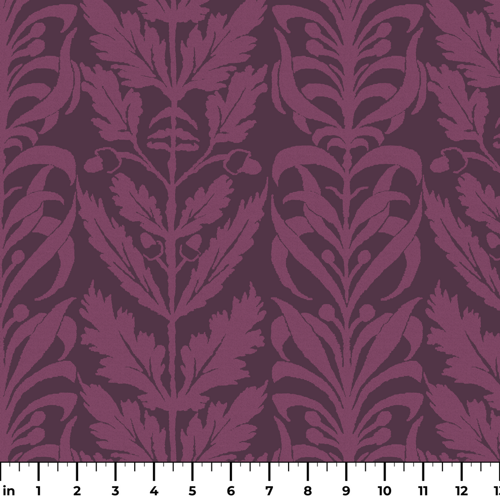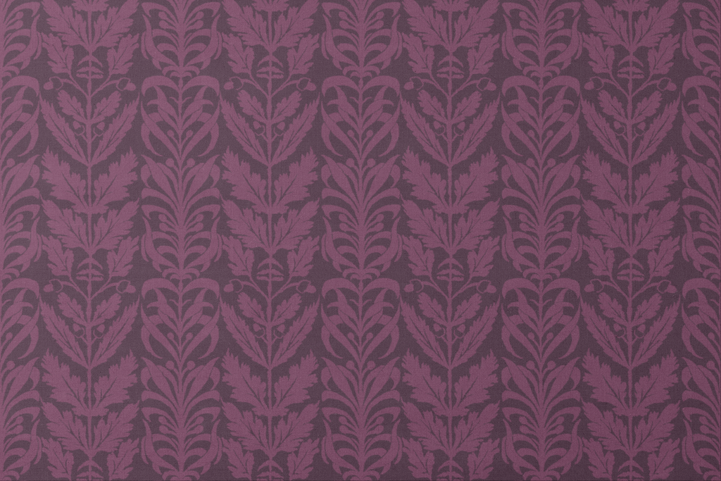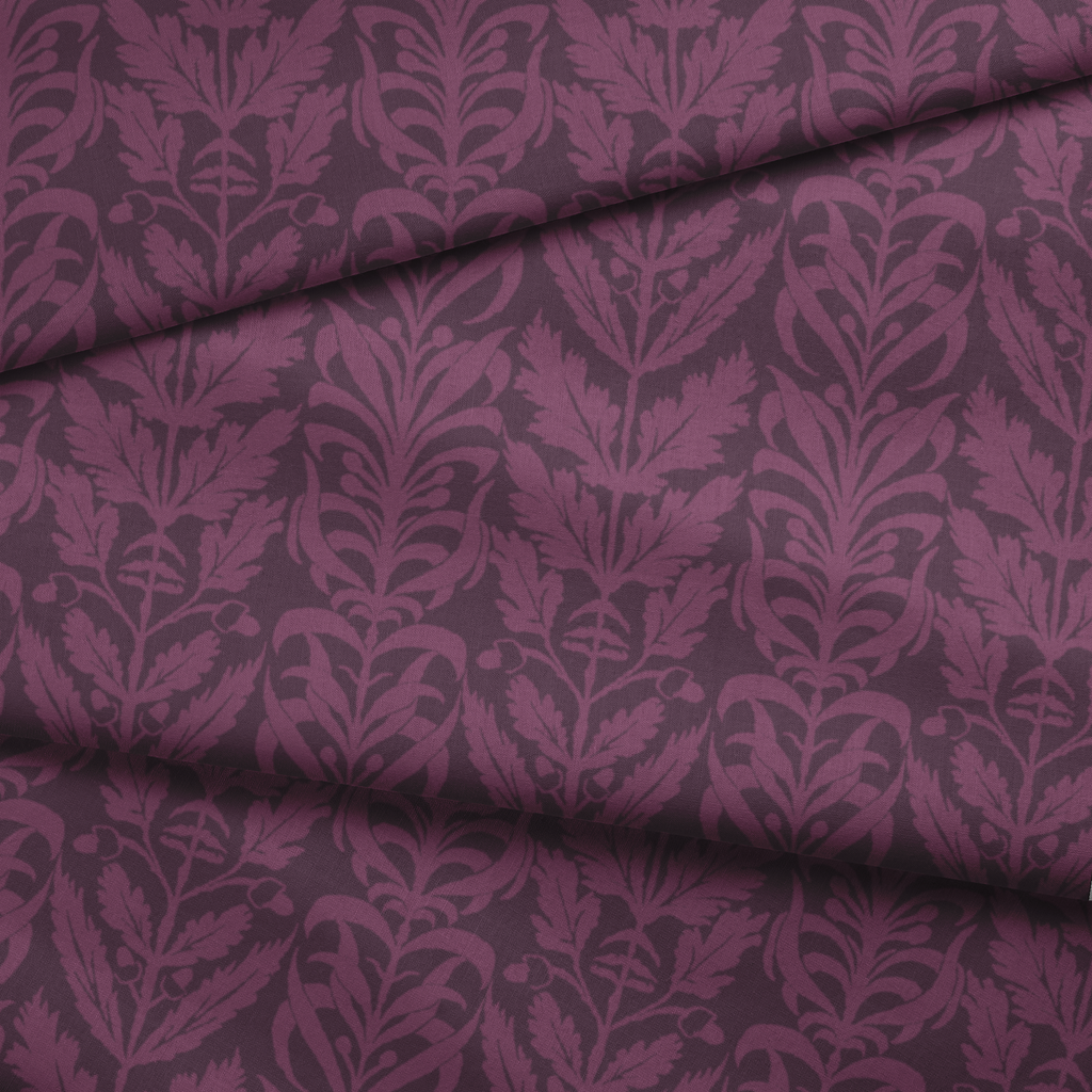 Elegant damask pattern in deep plum tones featuring symmetrical leaf motifs with a rich, heritage-inspired aesthetic.