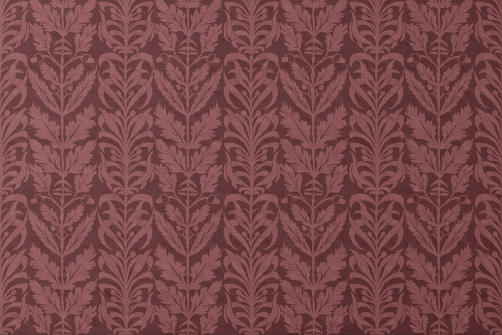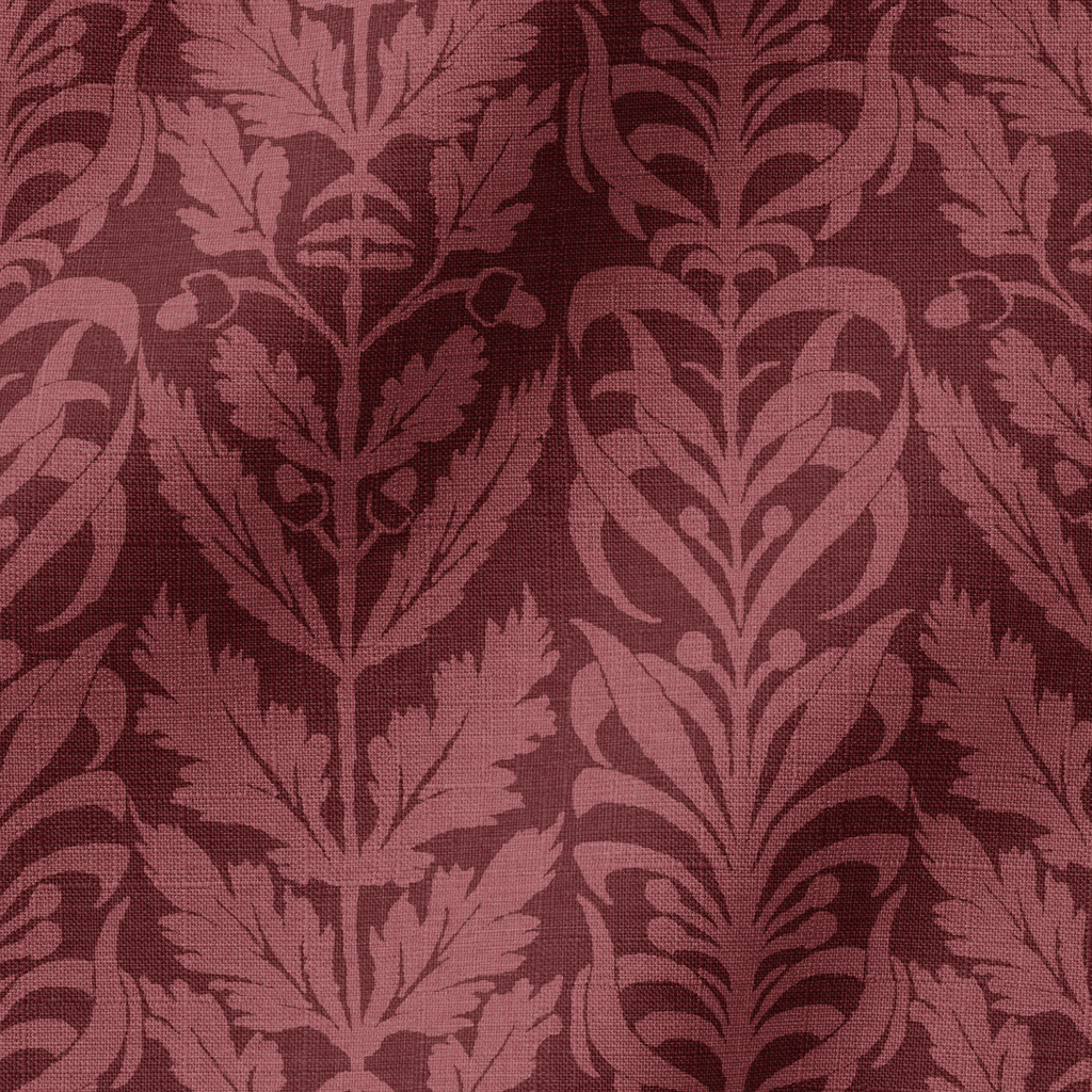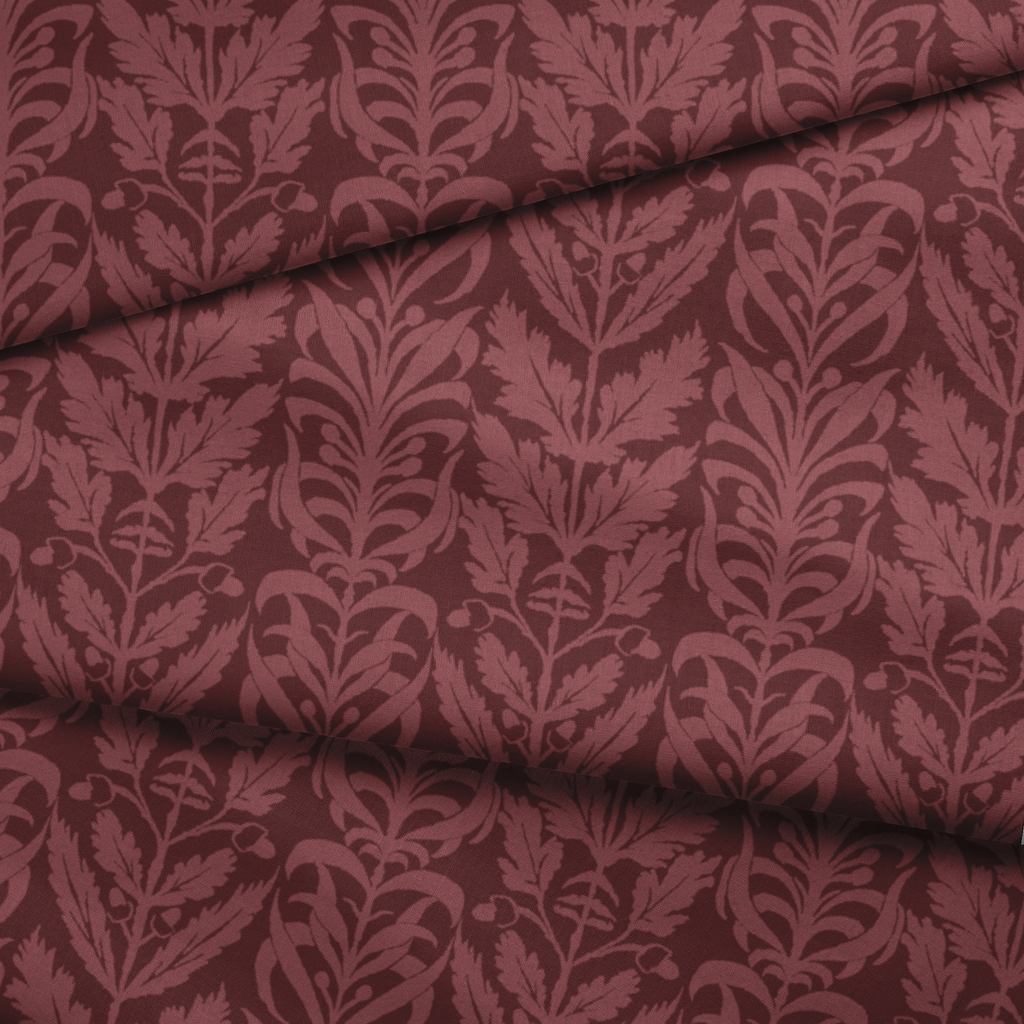 Elegant damask pattern in deep burgundy tones featuring symmetrical leaf motifs with a rich, heritage-inspired aesthetic.