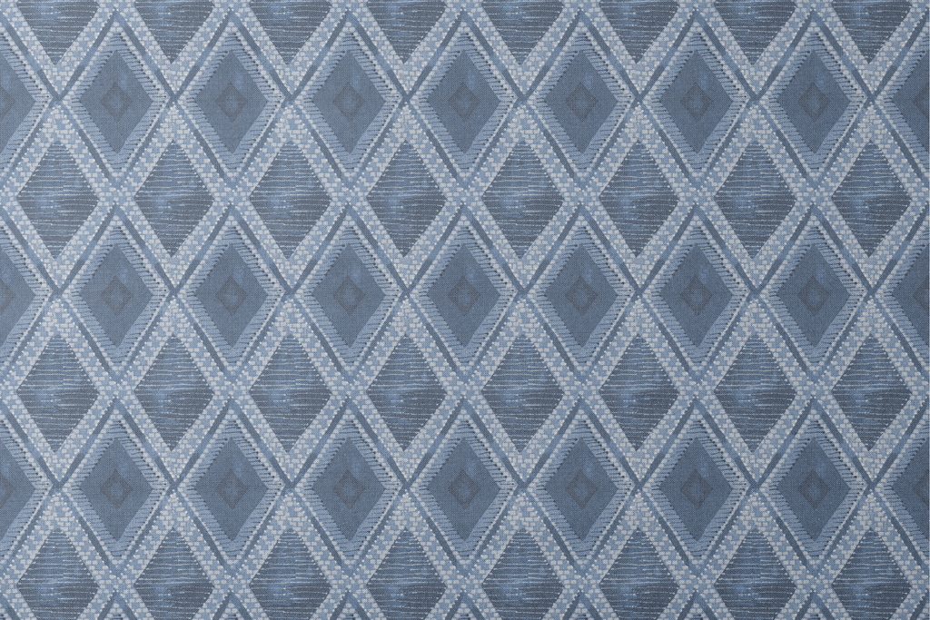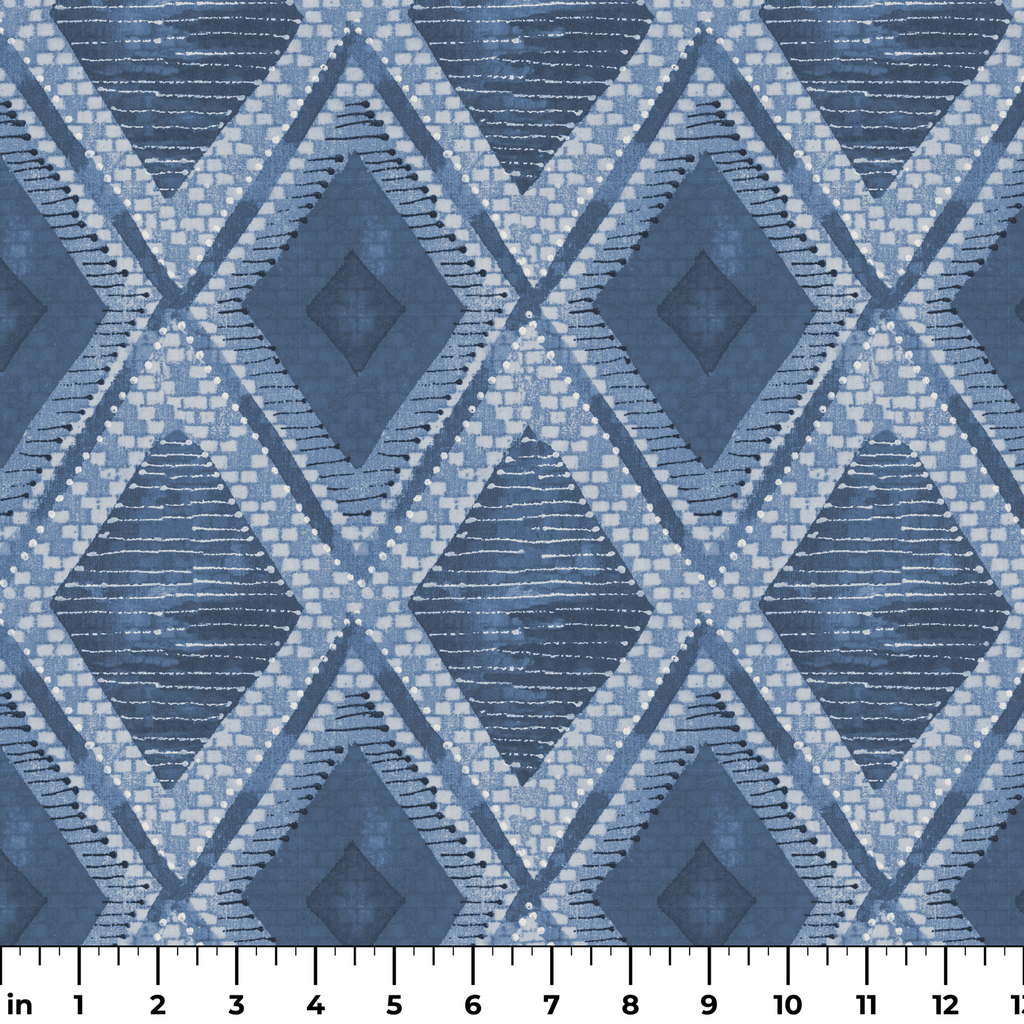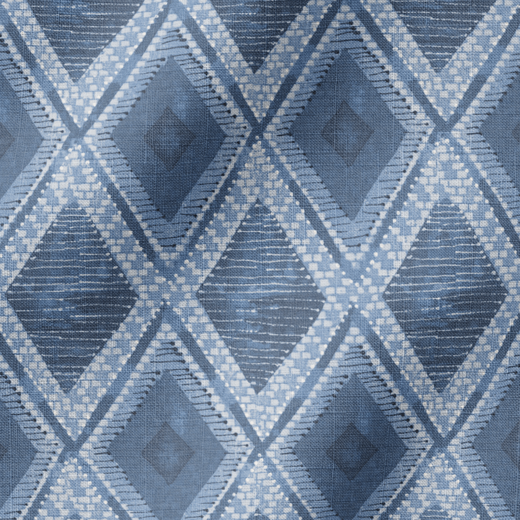 Modern geometric diamond pattern in shades of navy and sky blue. This contemporary design features overlapping lines creating a stylish tribal-inspired arrangement for any space.