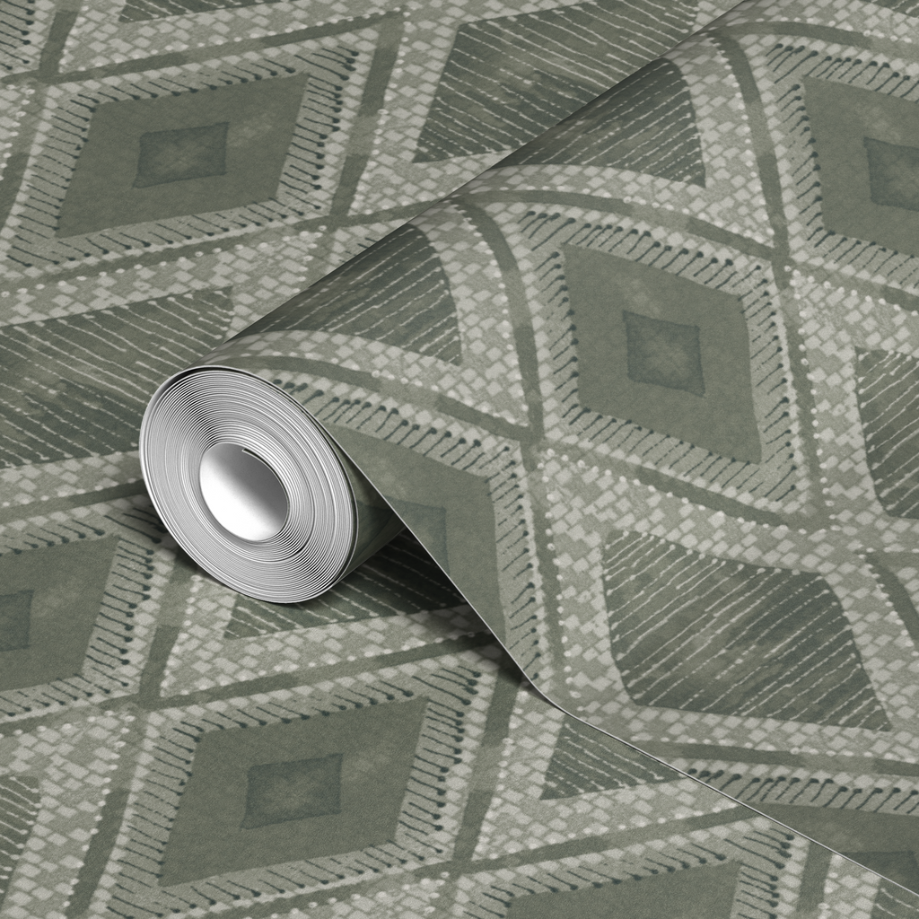 Modern geometric diamond pattern in shades of green and cream. This contemporary design features overlapping lines creating a stylish tribal-inspired arrangement for any space.