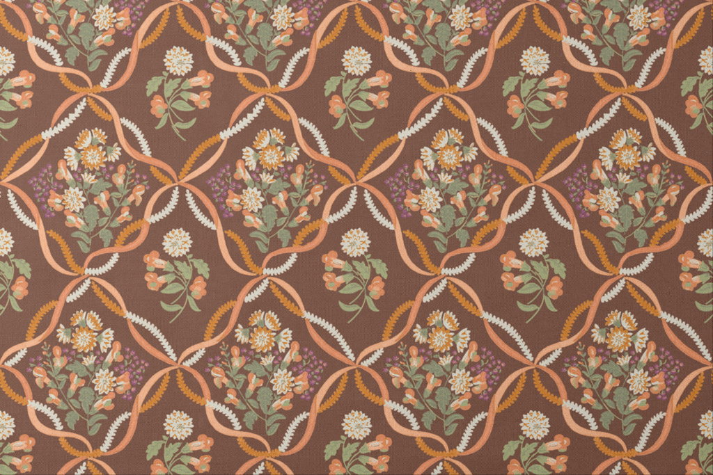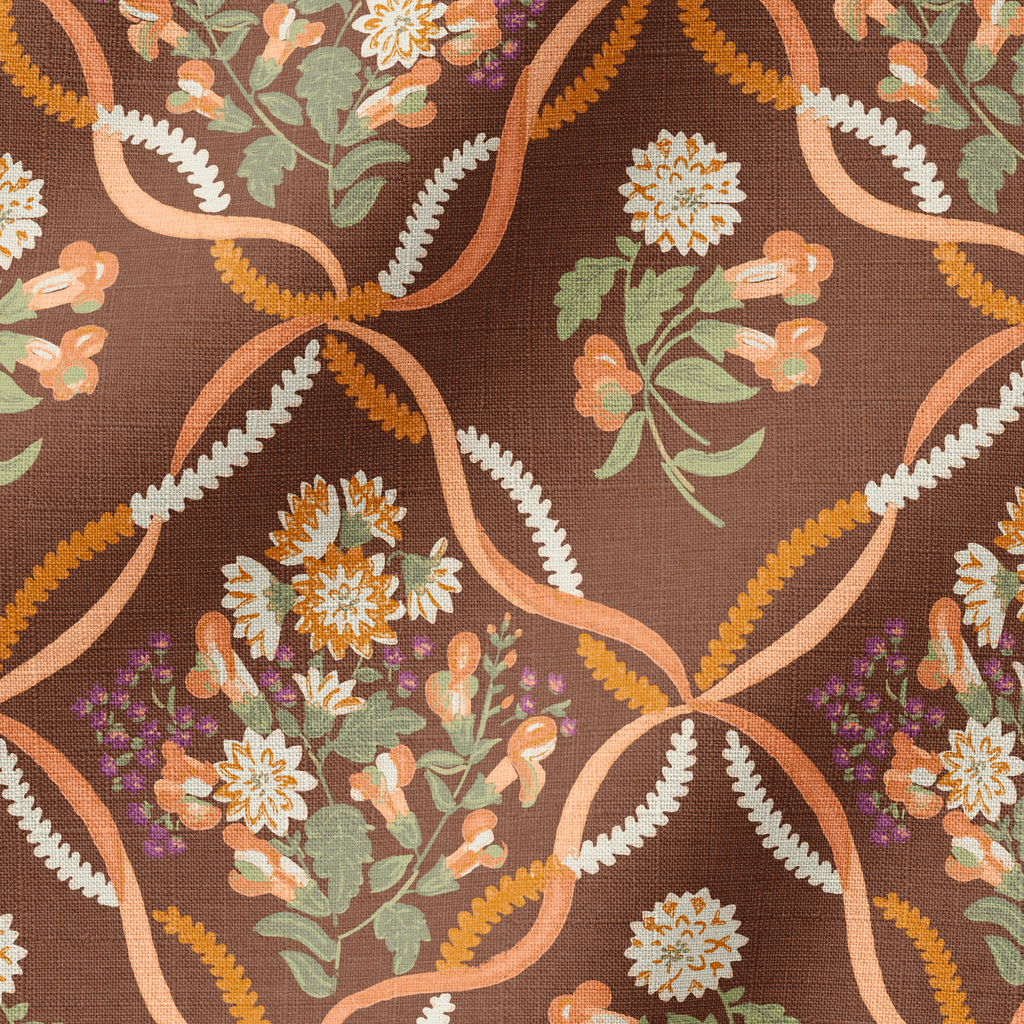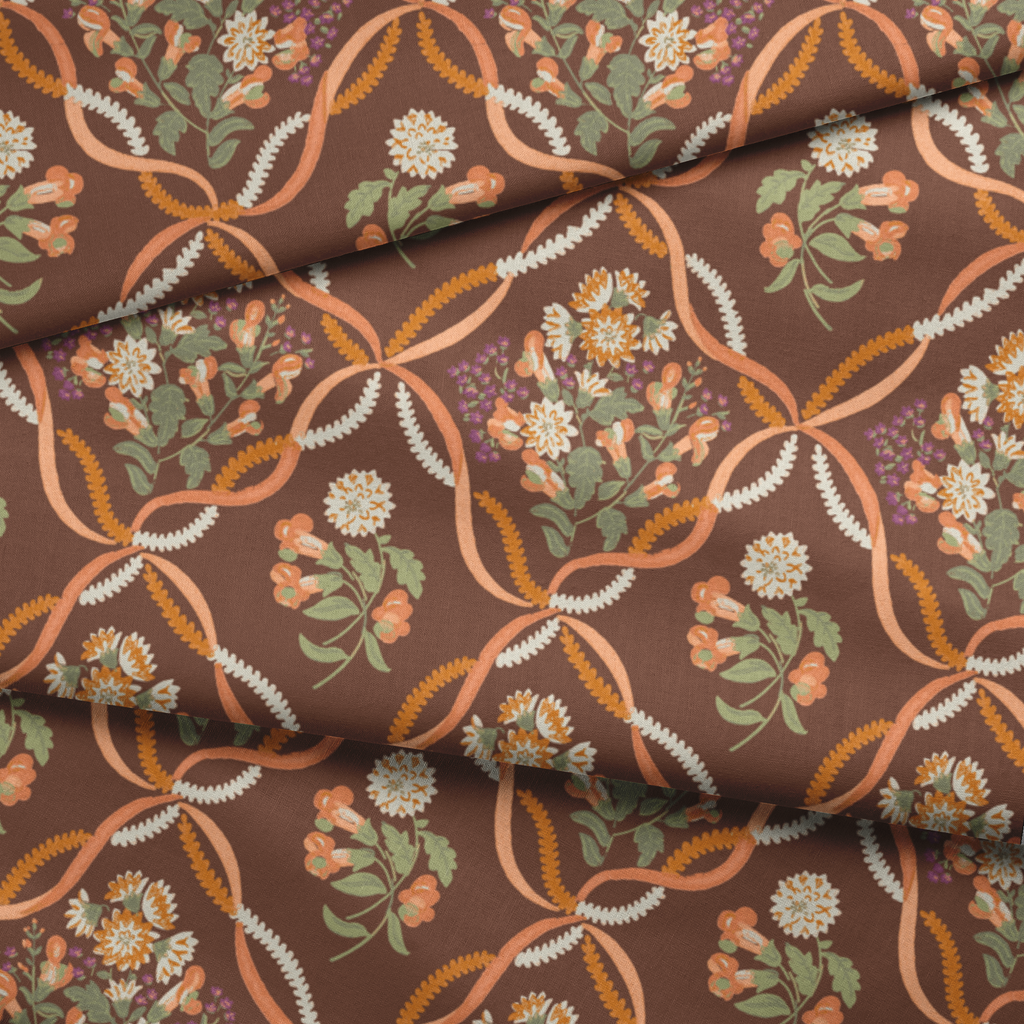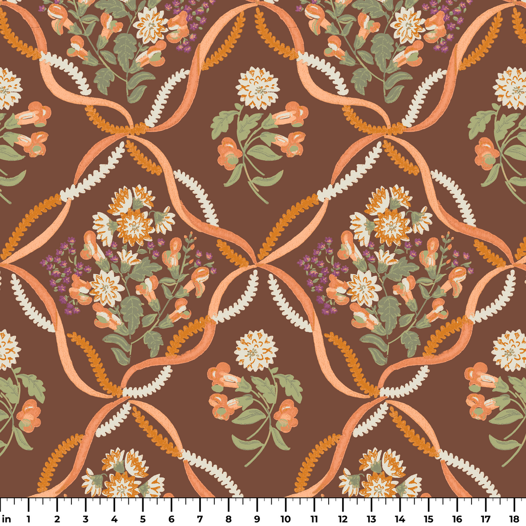 Elegant orange floral design featuring delicate daisies and floral ferns, arranged in a classic diamond lattice. This vintage-inspired botanical print blends timeless sophistication with natural charm. Ideal for heritage-style interiors and lovers of traditional floral patterns.