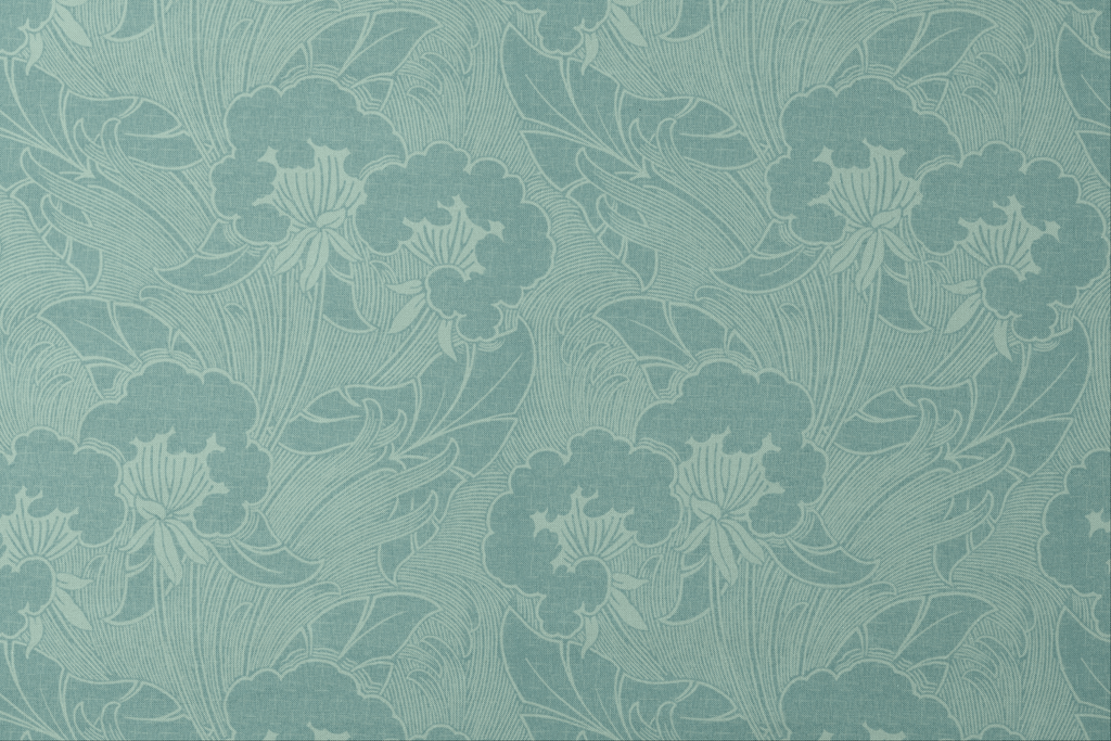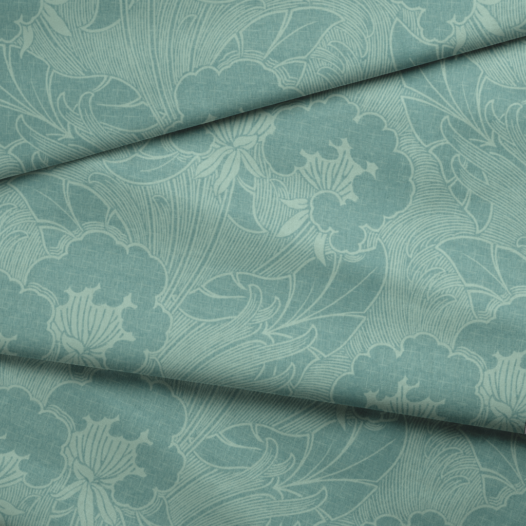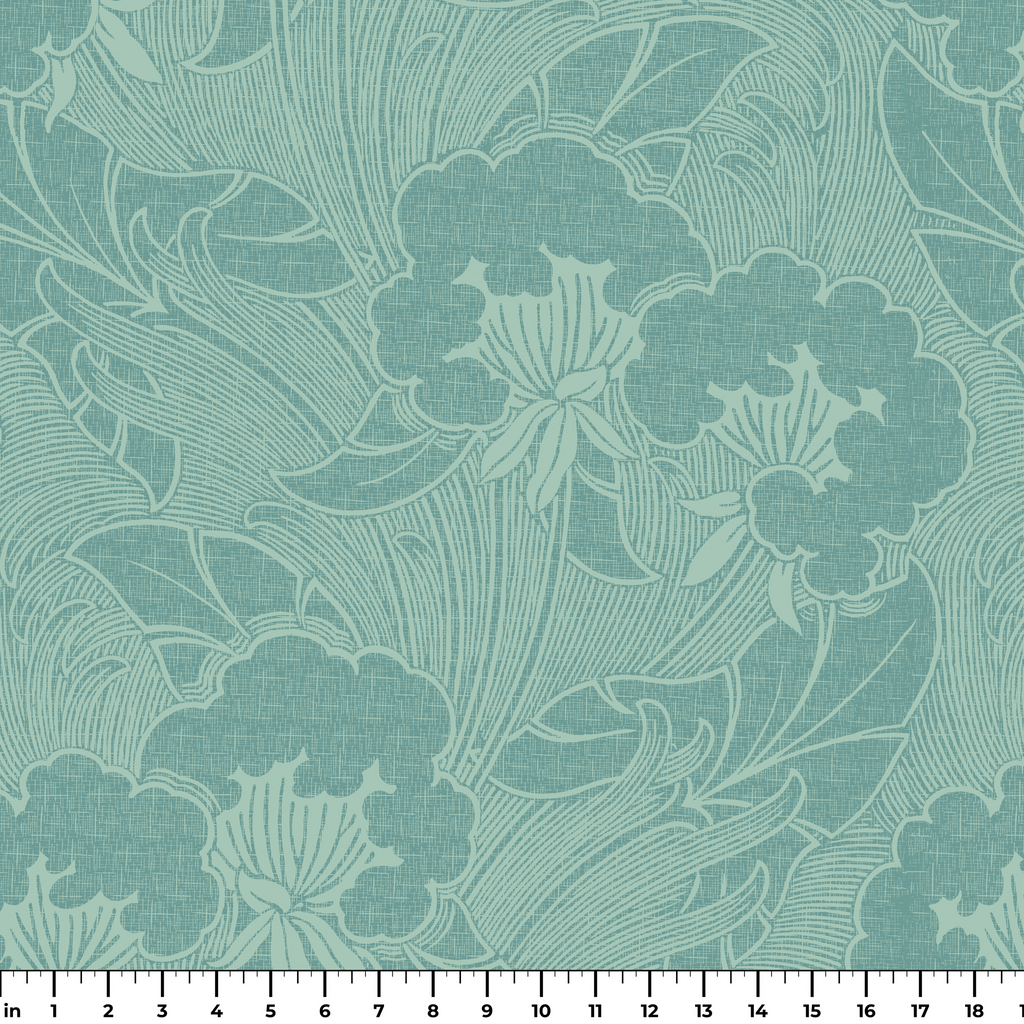 Elegant floral pattern in soft teal tones with detailed line art of blooms and leaves, with a timeless, nature-inspired aesthetic.