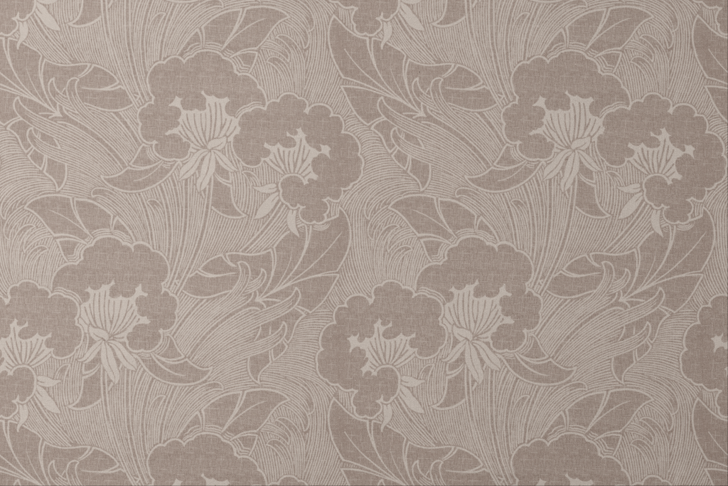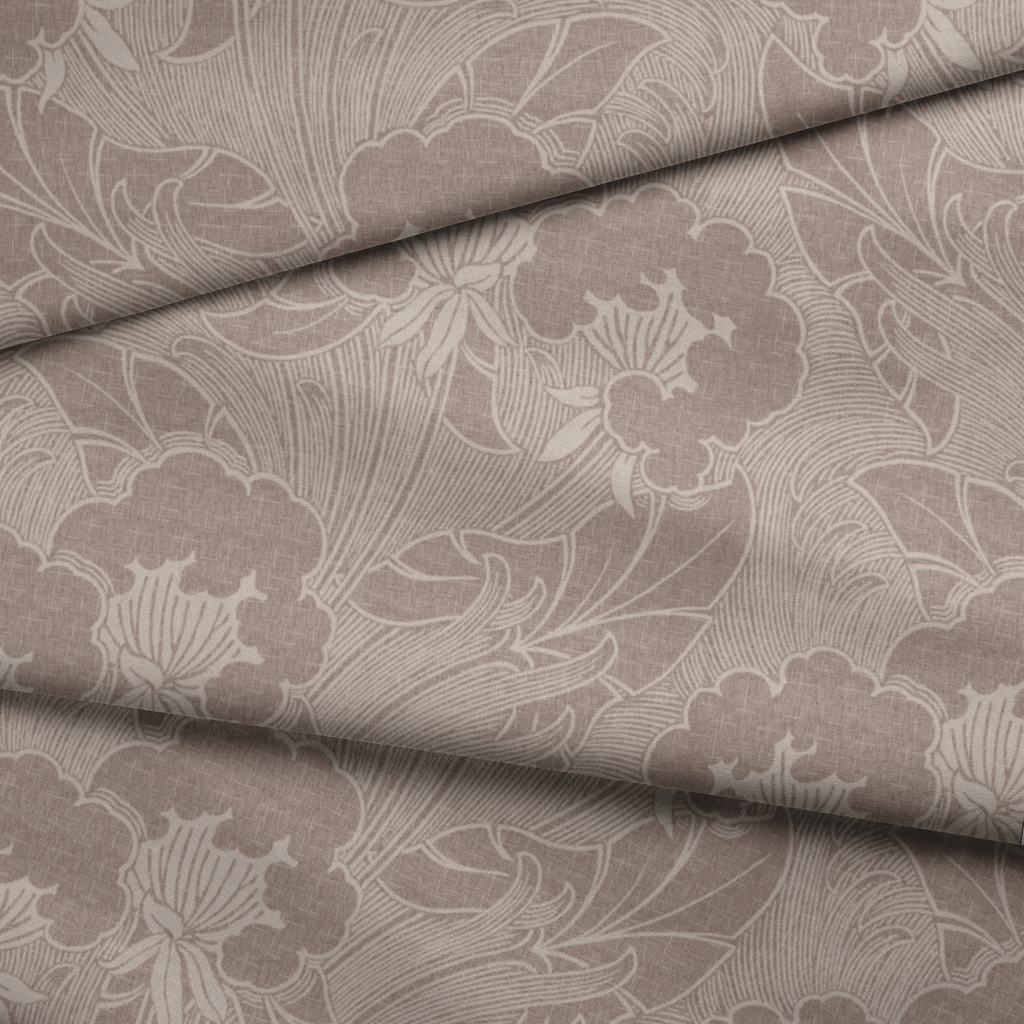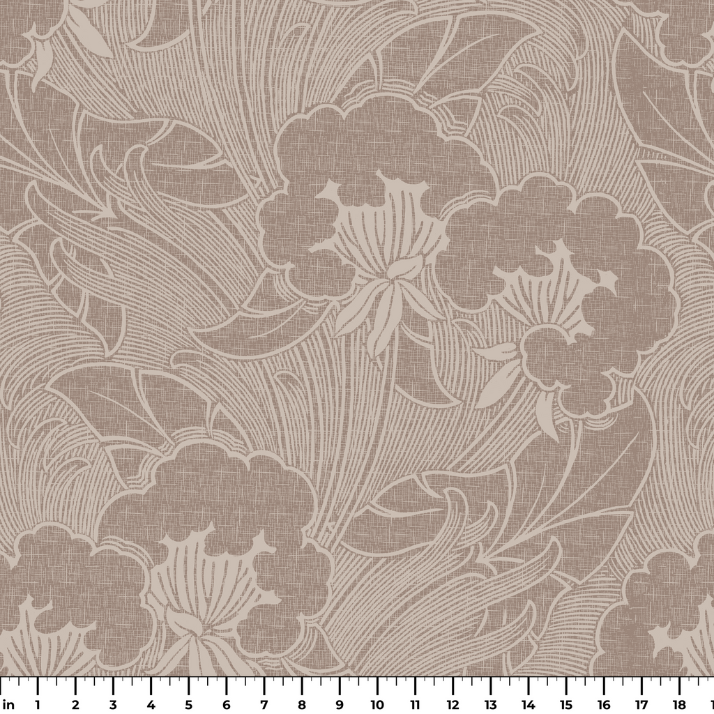 Elegant floral pattern in soft taupe tones with detailed line art of blooms and leaves, with a timeless, nature-inspired aesthetic.