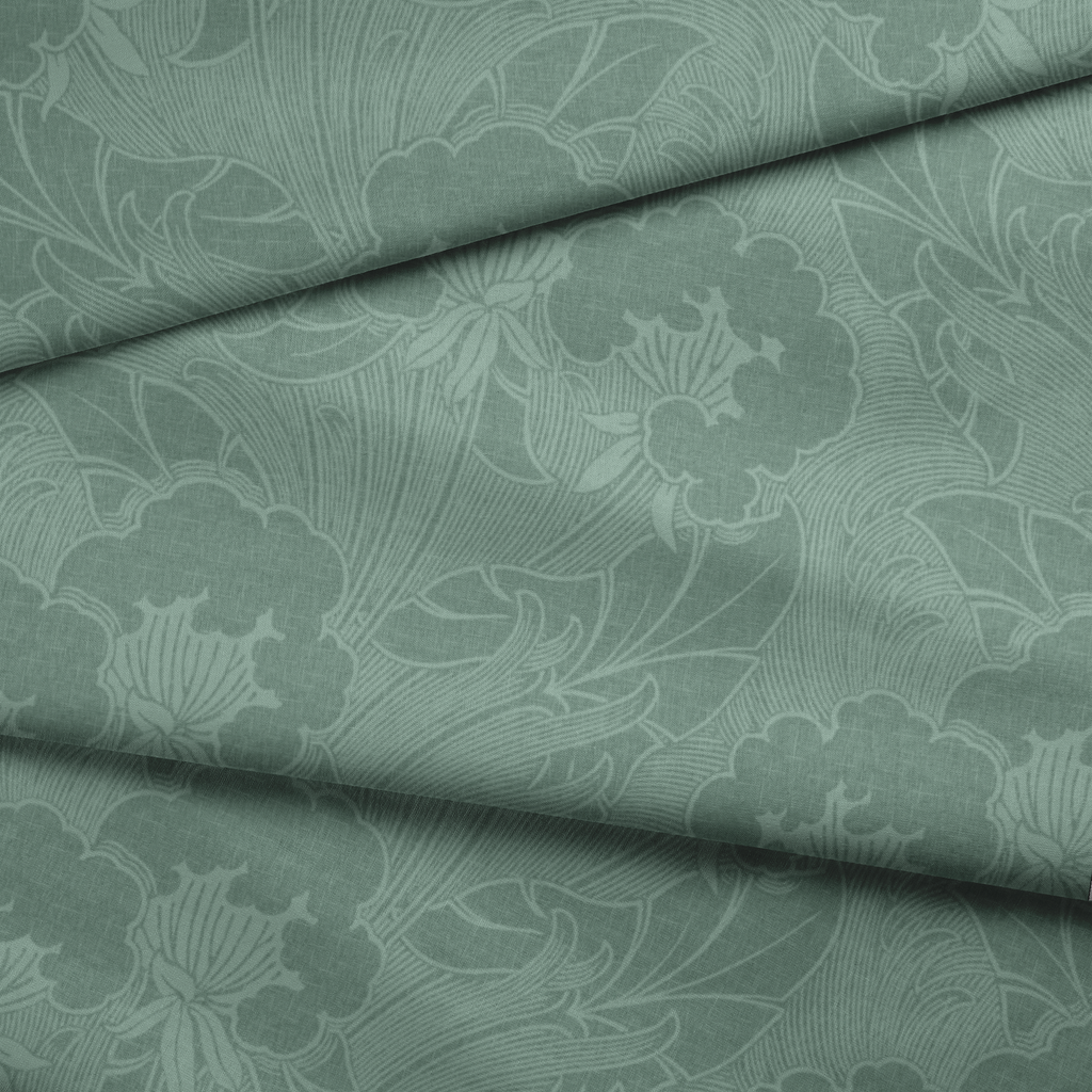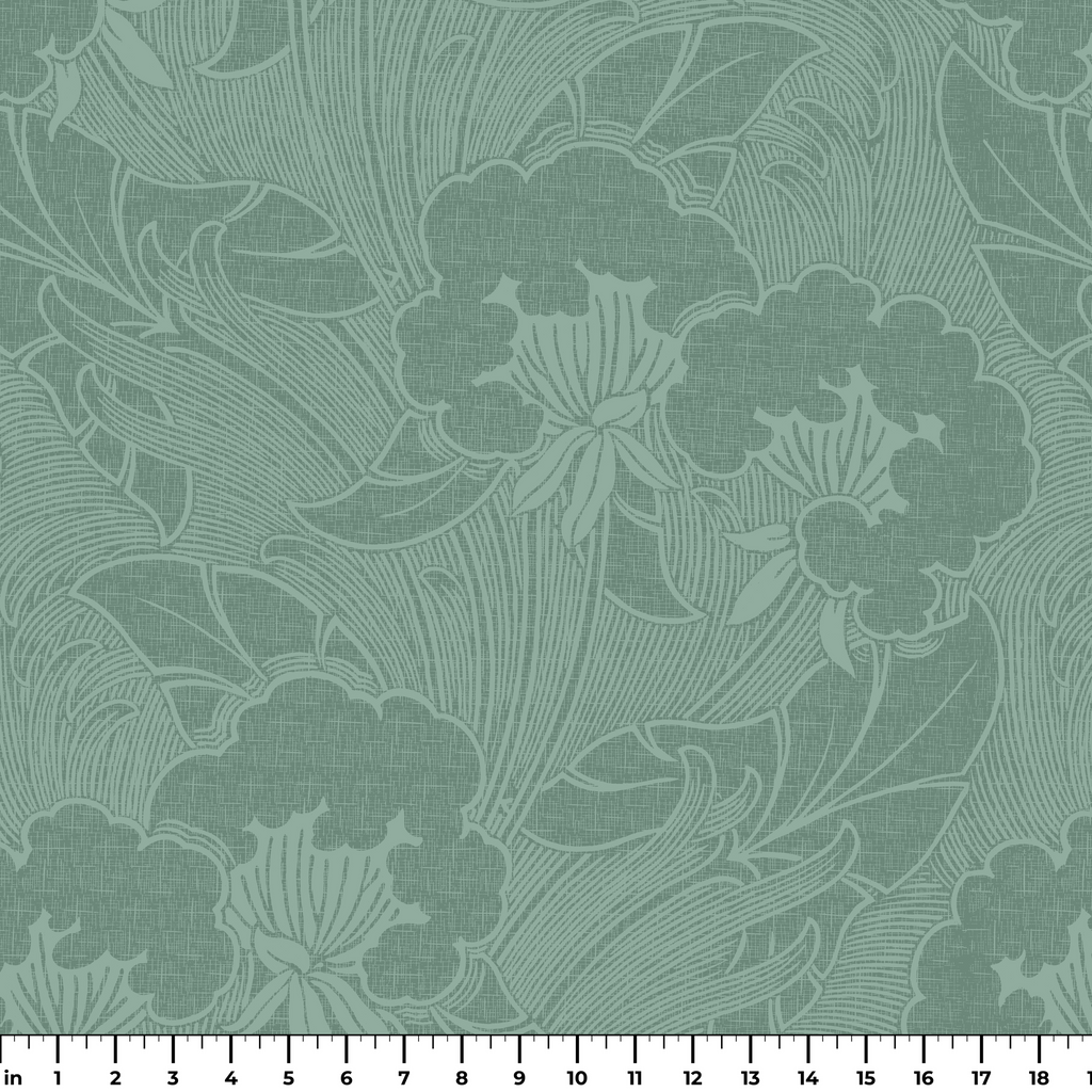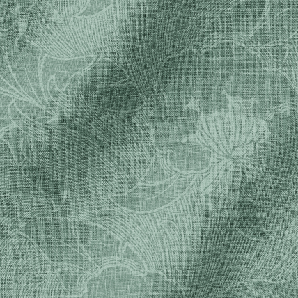 Elegant floral pattern in soft sage green tones with detailed line art of blooms and leaves, with a timeless, nature-inspired aesthetic.