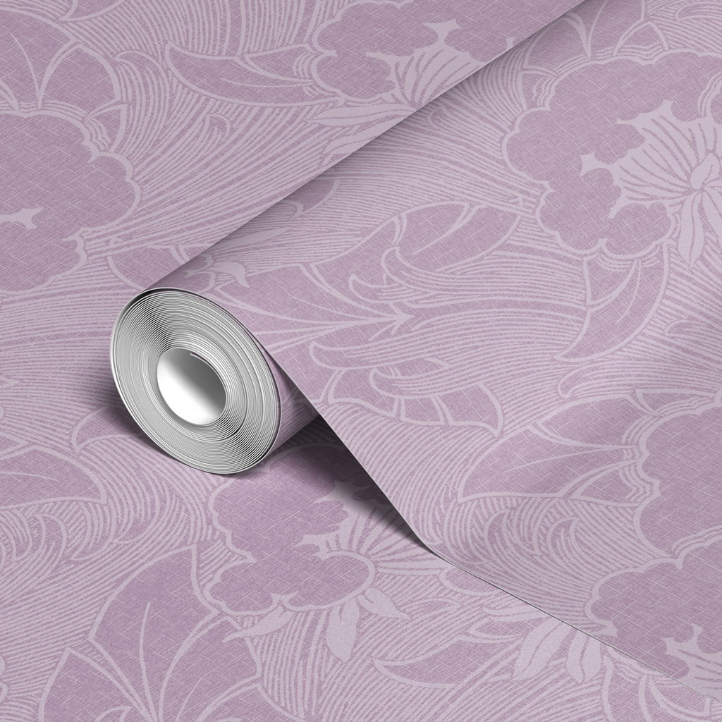 Elegant lavender floral wallpaper with delicate line art peonies and intricate leaf motifs, creating a romantic, contemporary feel in a soft monochromatic palette.