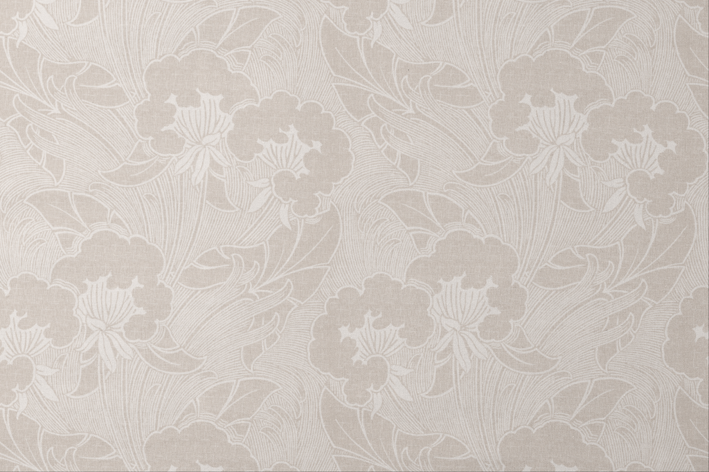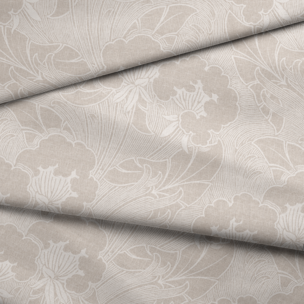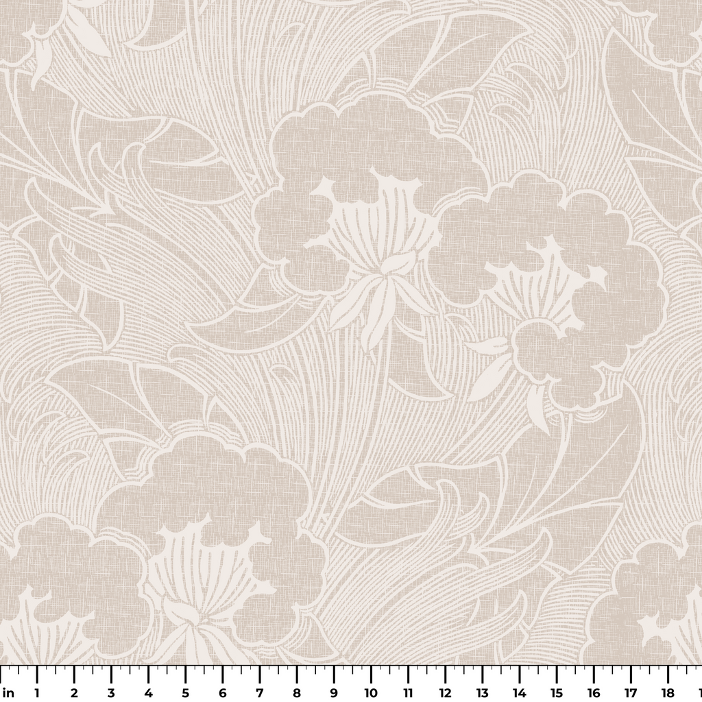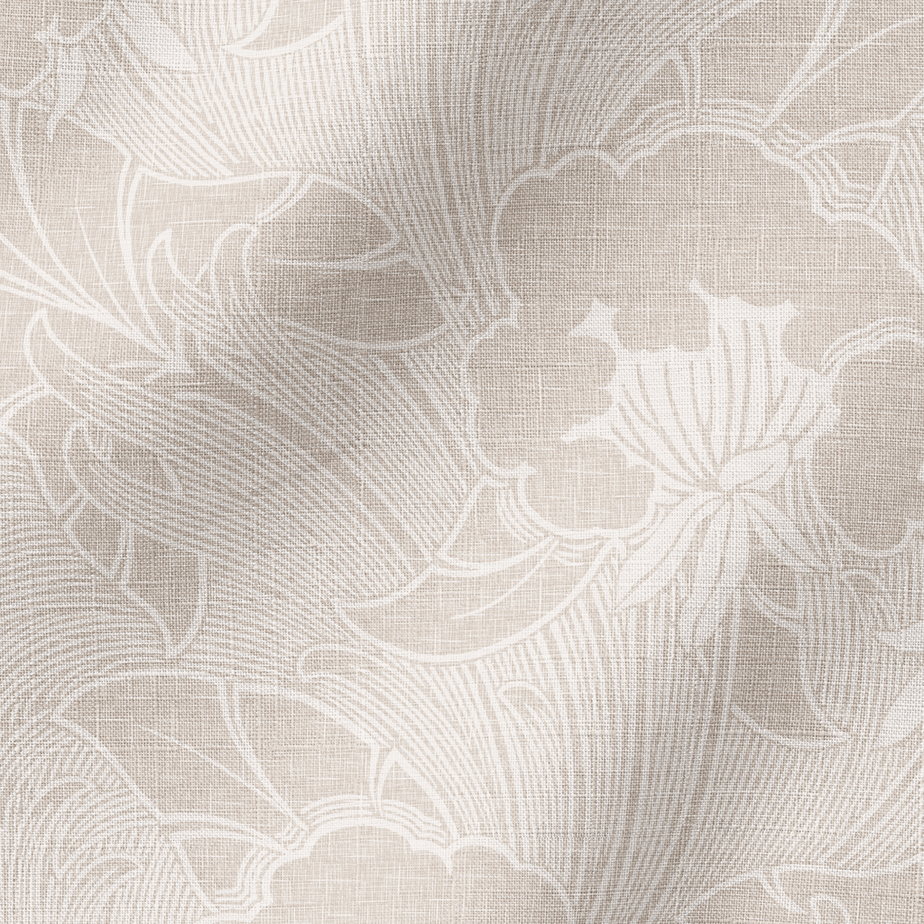 Elegant floral pattern in soft beige and white with detailed line art of blooms and leaves, with a timeless, nature-inspired aesthetic.