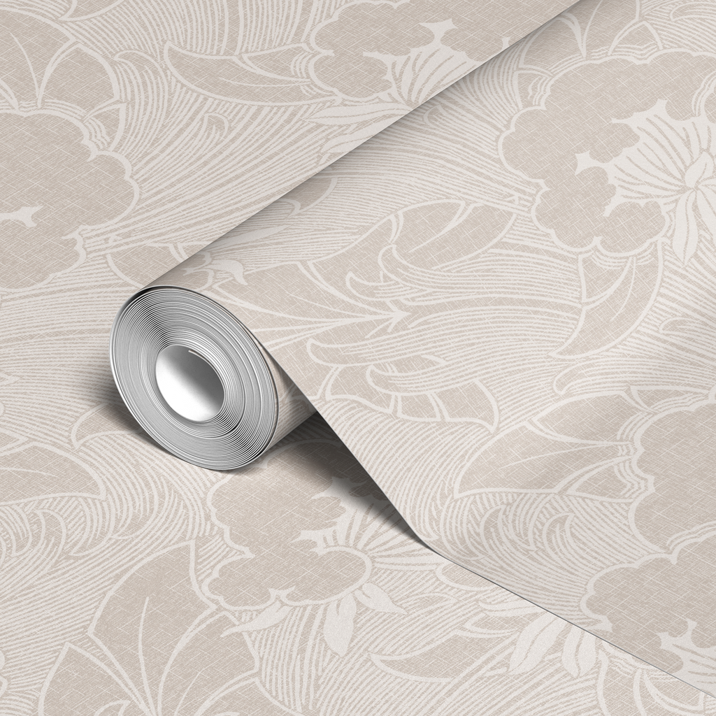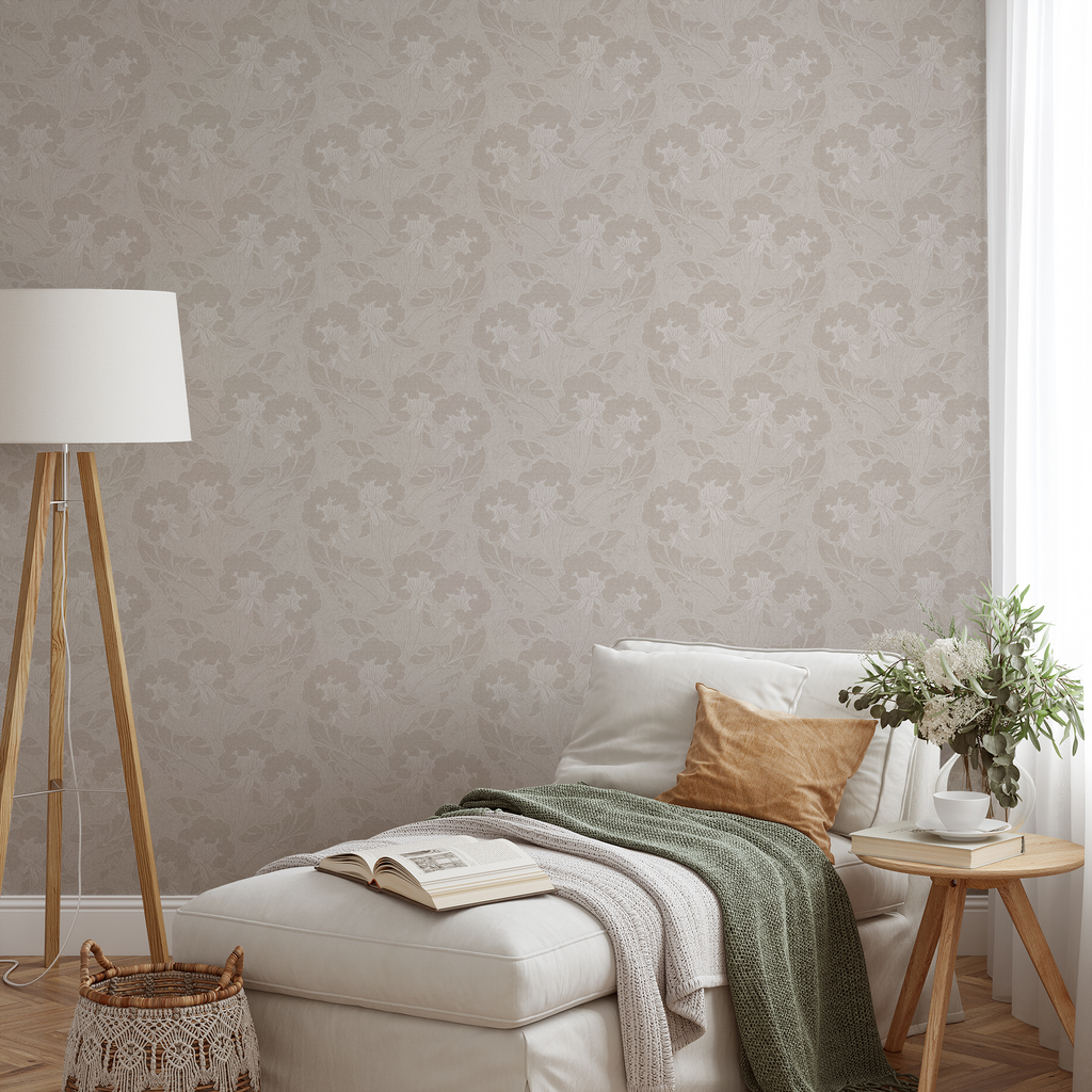 Elegant floral wallpaper in subtle beige tones featuring stylized blooms and graceful leaves in a contemporary Art Nouveau pattern, perfect for sophisticated home decor.