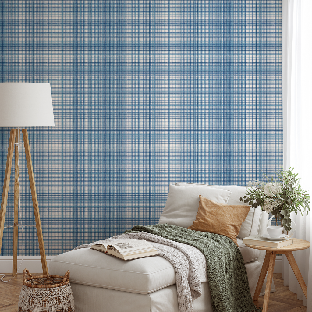 Classic plaid pattern in light and dark blue tones with a traditional geometric design, perfect for heritage-inspired spaces.