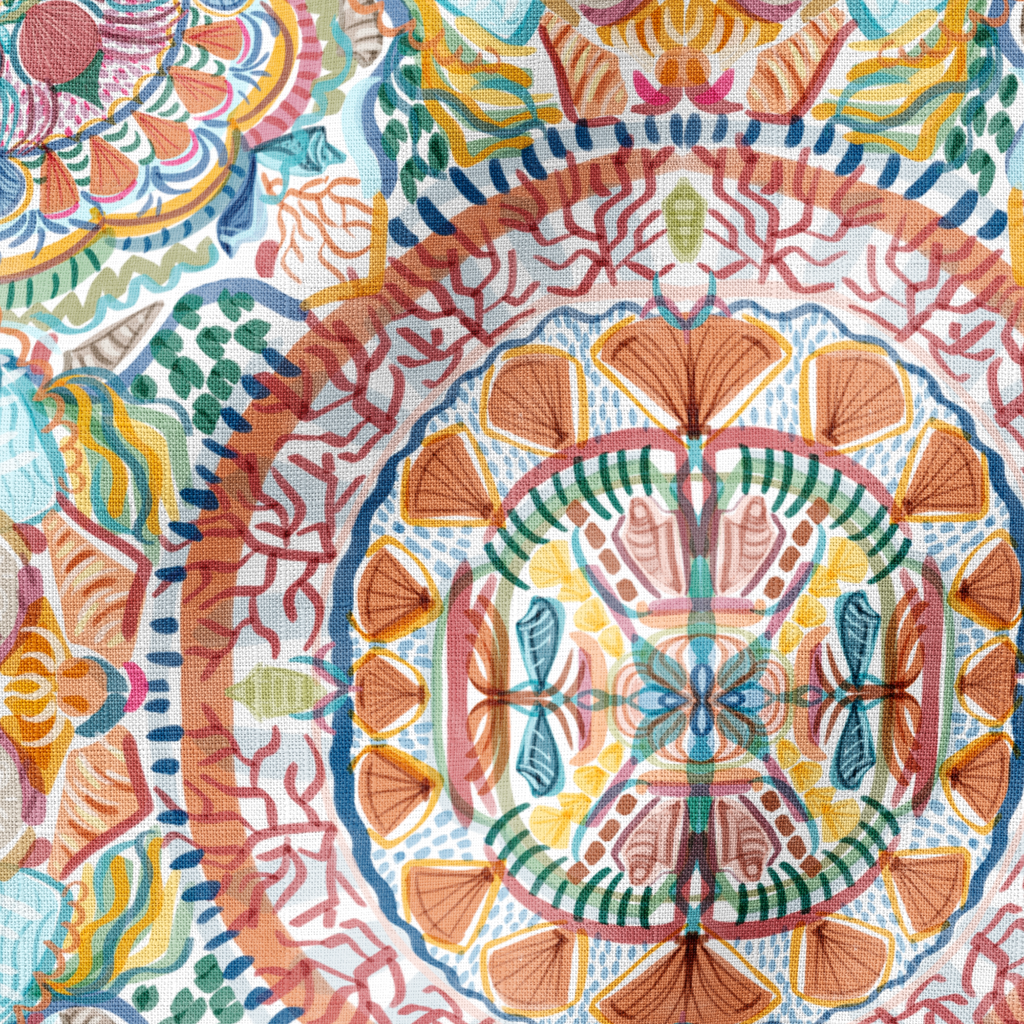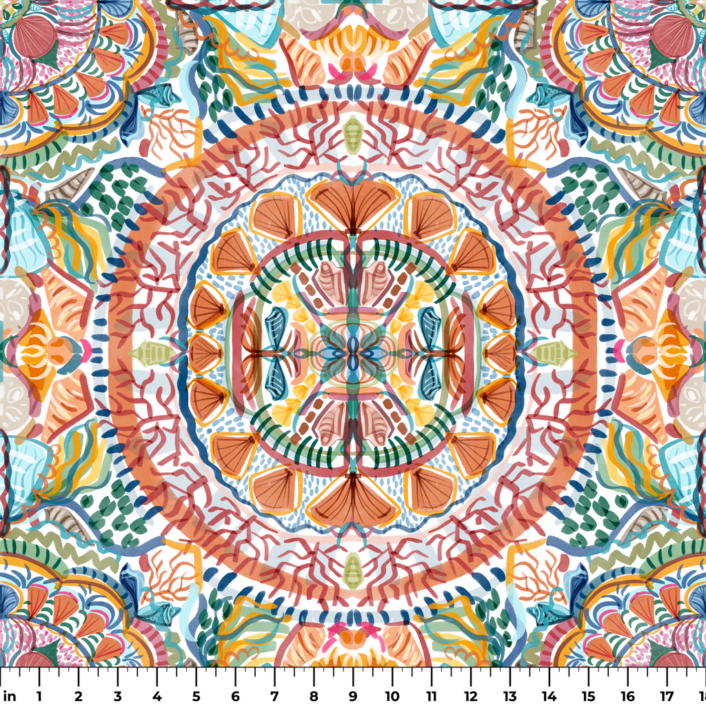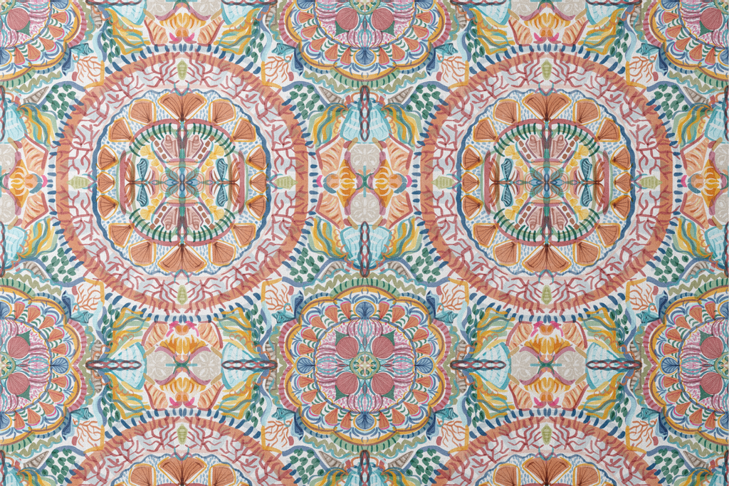 Vibrant bohemian mandala design showcasing intricate geometric patterns in coral, turquoise, and orange. Perfect for any space with its ornate floral-inspired motifs and colorful concentric circles.