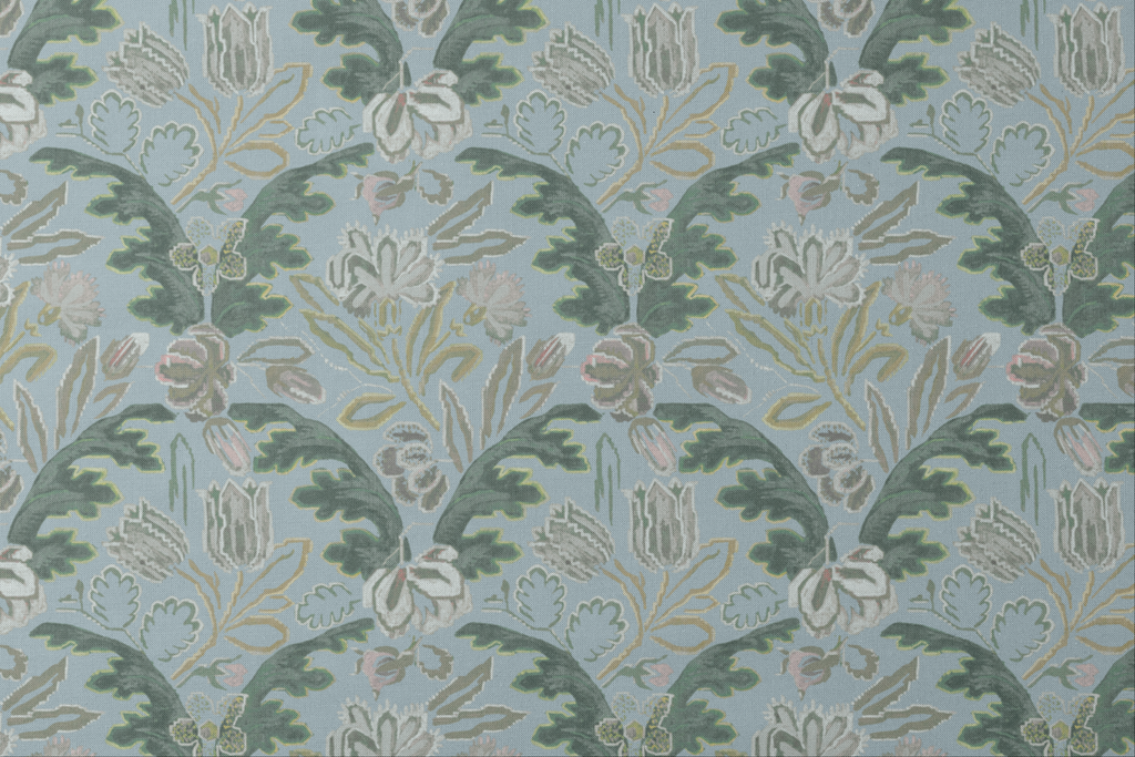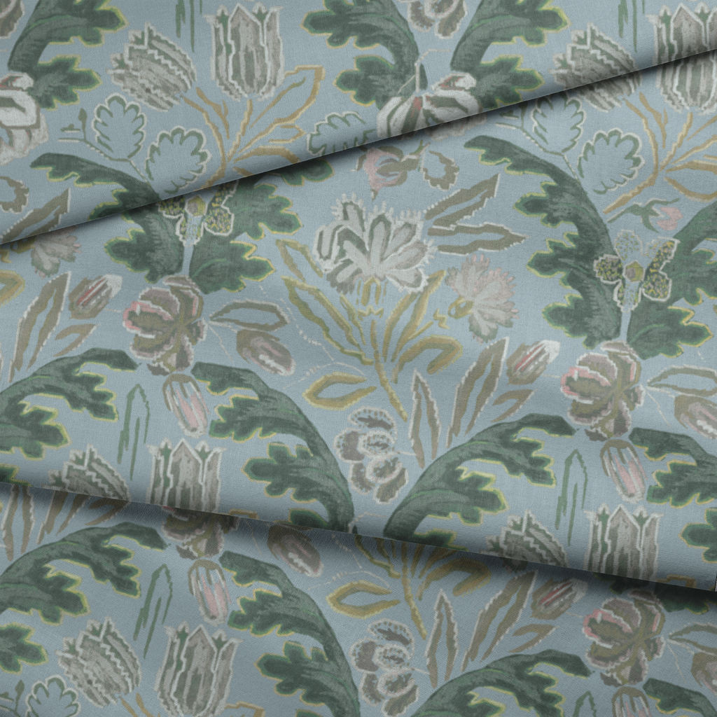 Elegant floral damask pattern with tulips and leaves in a sophisticated palette of sage, forest green, and soft blue tones. Traditional heritage design with flowing organic forms.
