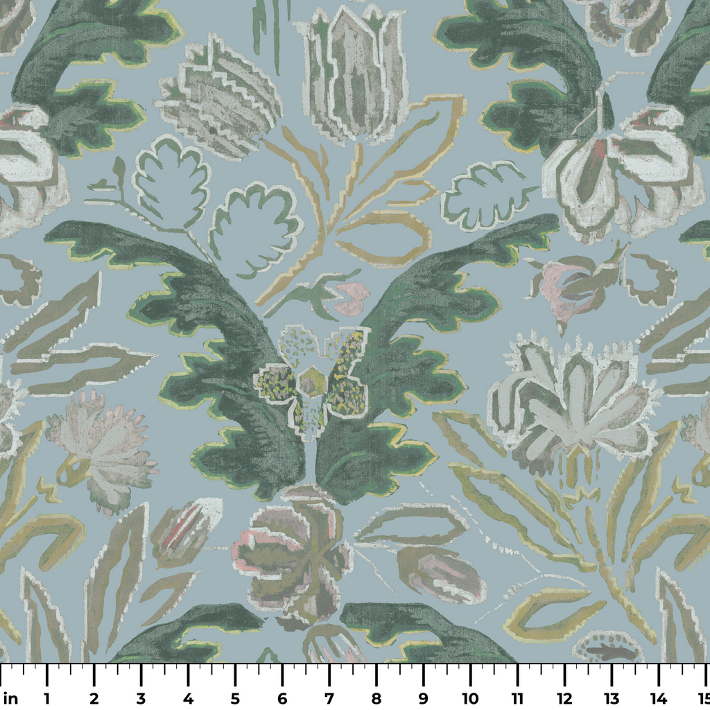 This rich vintage floral pattern features cream tulips and stylized blooms against a light blue background, perfect for elegant spaces with a classic William Morris inspired aesthetic.